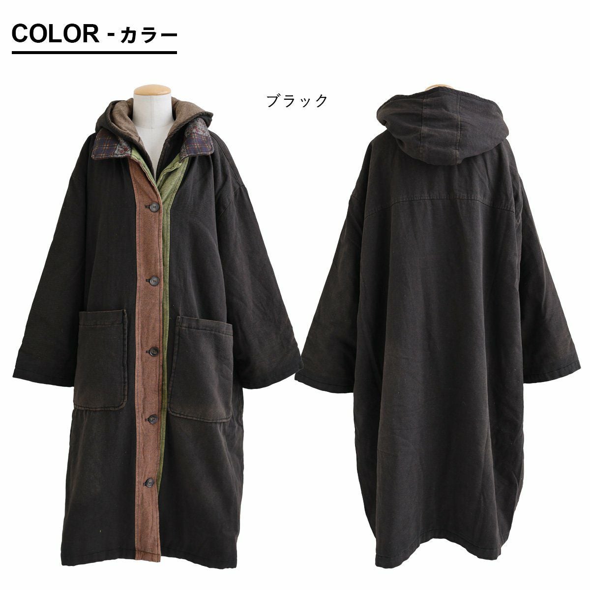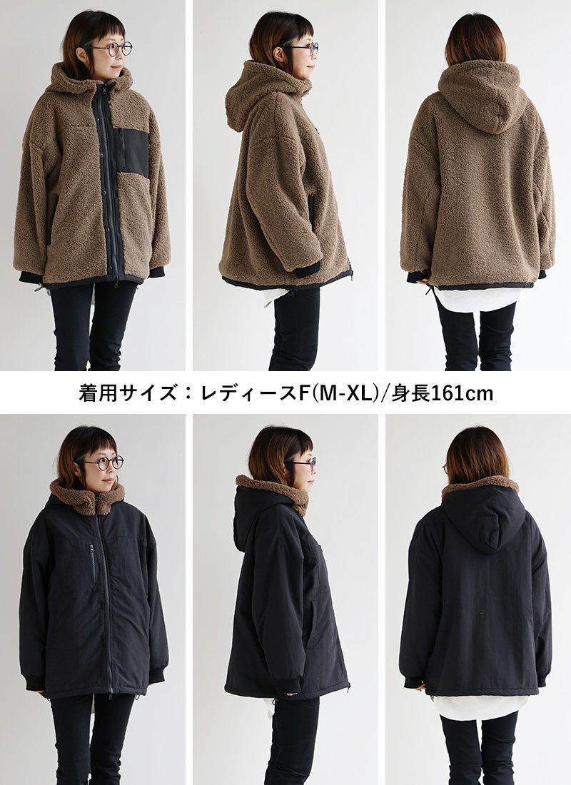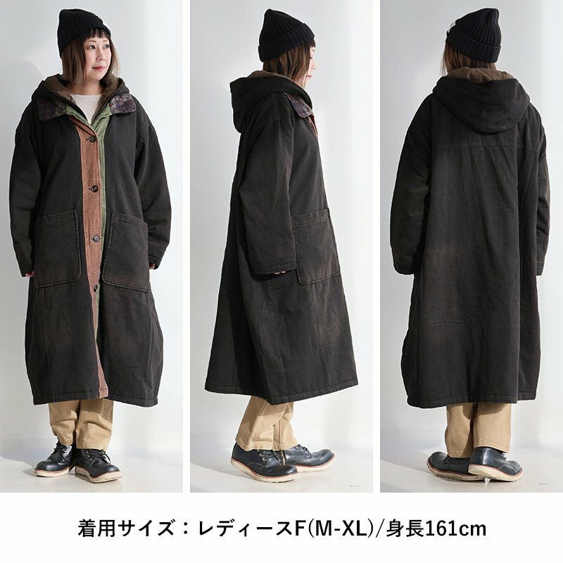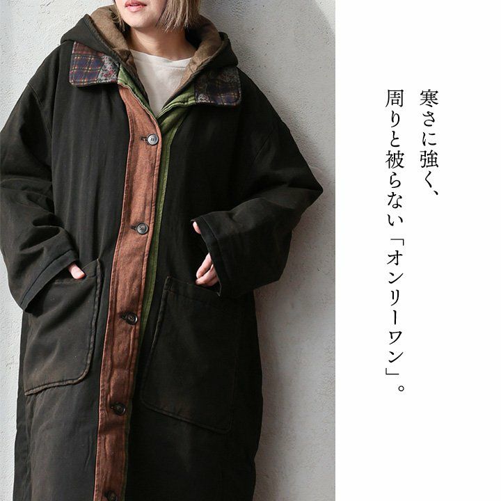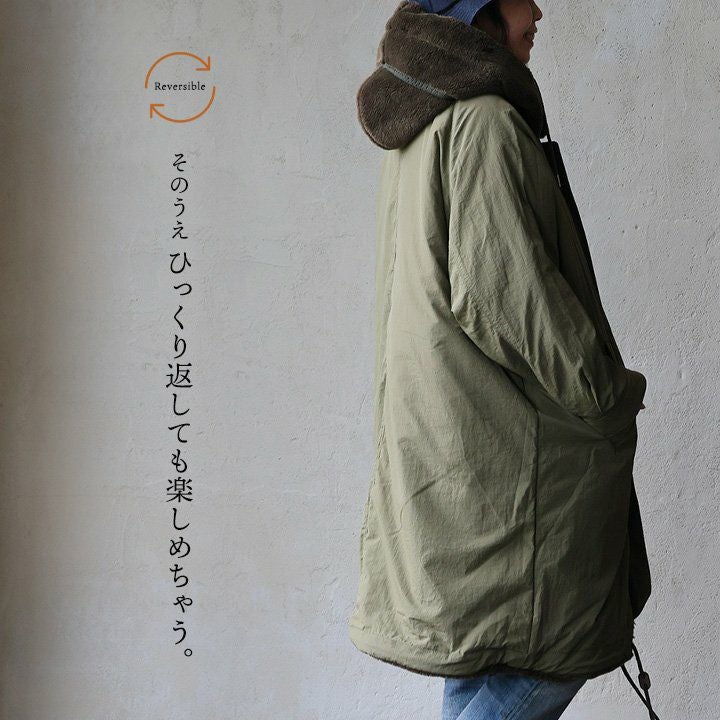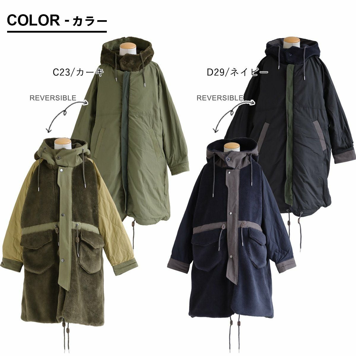 チグハグが面白くて、暖かくて、そのうえひっくり返しても楽しめちゃう。 コート ロングコート レディース 長袖 フード付き リバーシブル フェイクファー ボア 中綿 ポリエステル ナイロン異素材切り替え 暖かい 体型カバー 大きいサイズ ゆったり カジュアル 秋 冬 パティ GENTIL ジャンティ