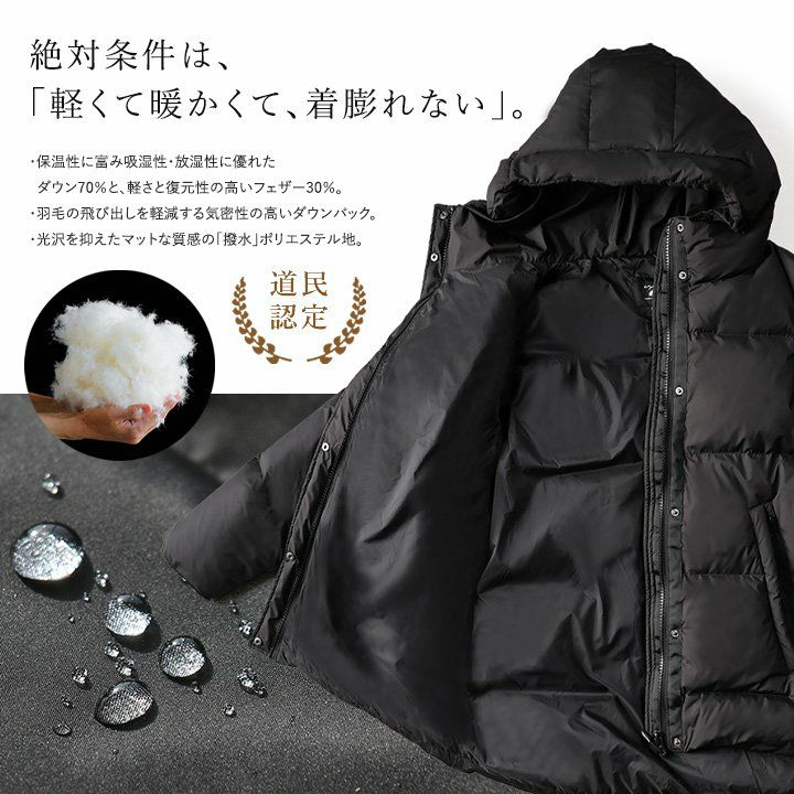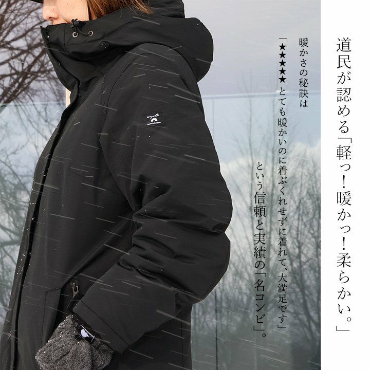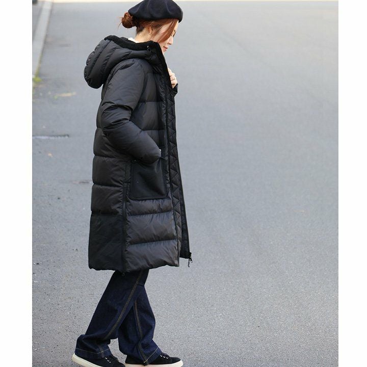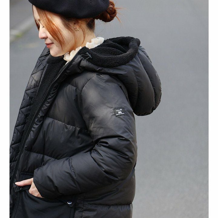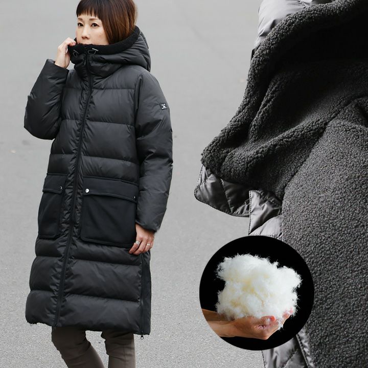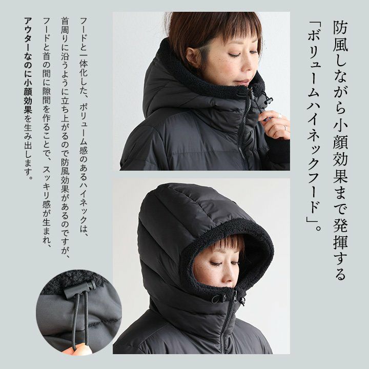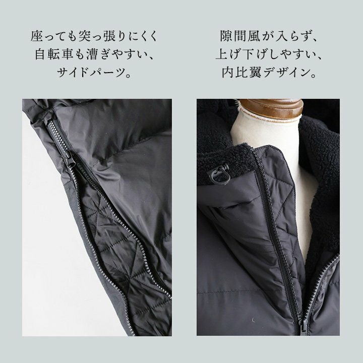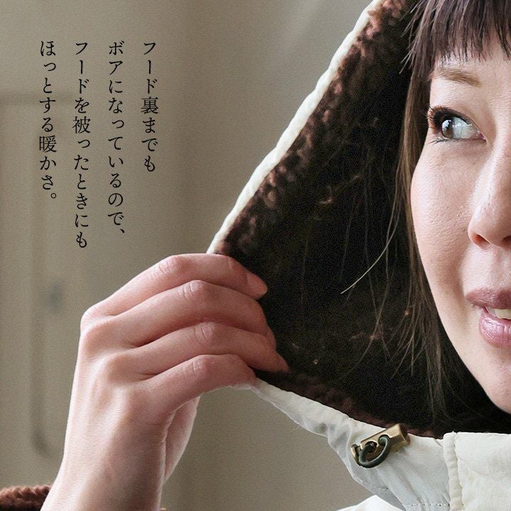 トレンドに左右されない、「裏ボア」スマートダウン。 ダウンコート レディース ダウン ミドル丈 撥水 軽い 防風 暖かい すっきり 着痩せ 細見せ アウター 冬 リブ ハイネック ダウンジャケット ロングコート フードボア ポケット スポーツ観戦 旅行 通勤 通学 カジュアル パティ ezo& エゾト