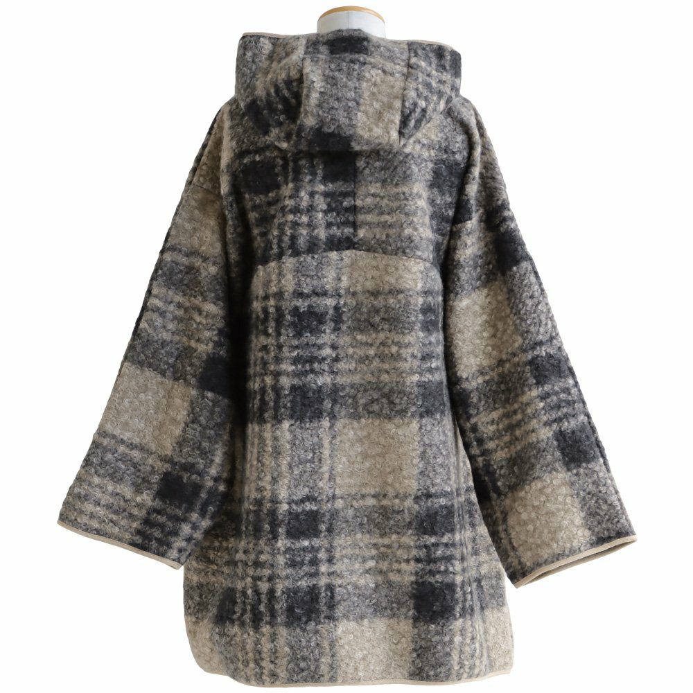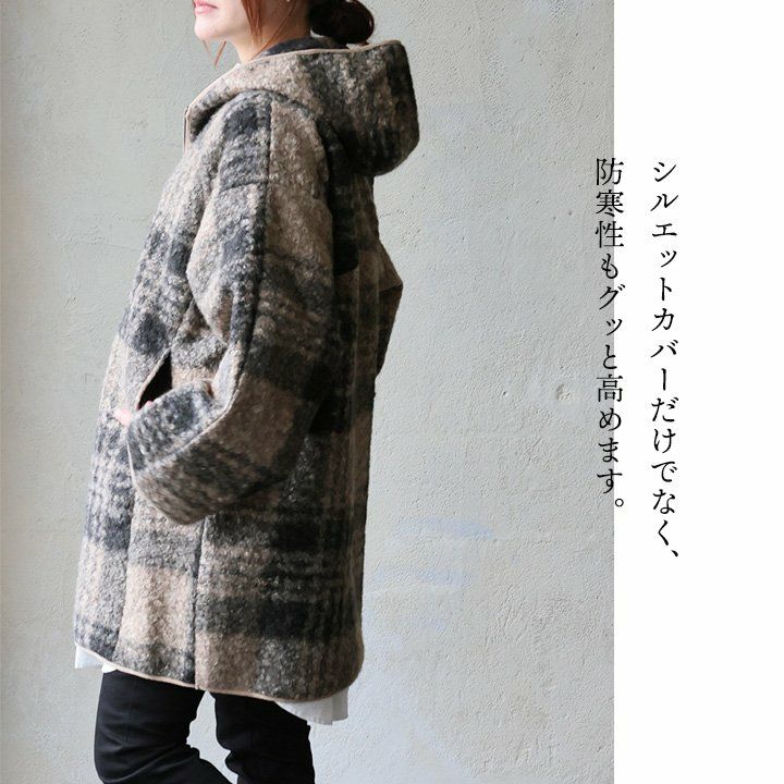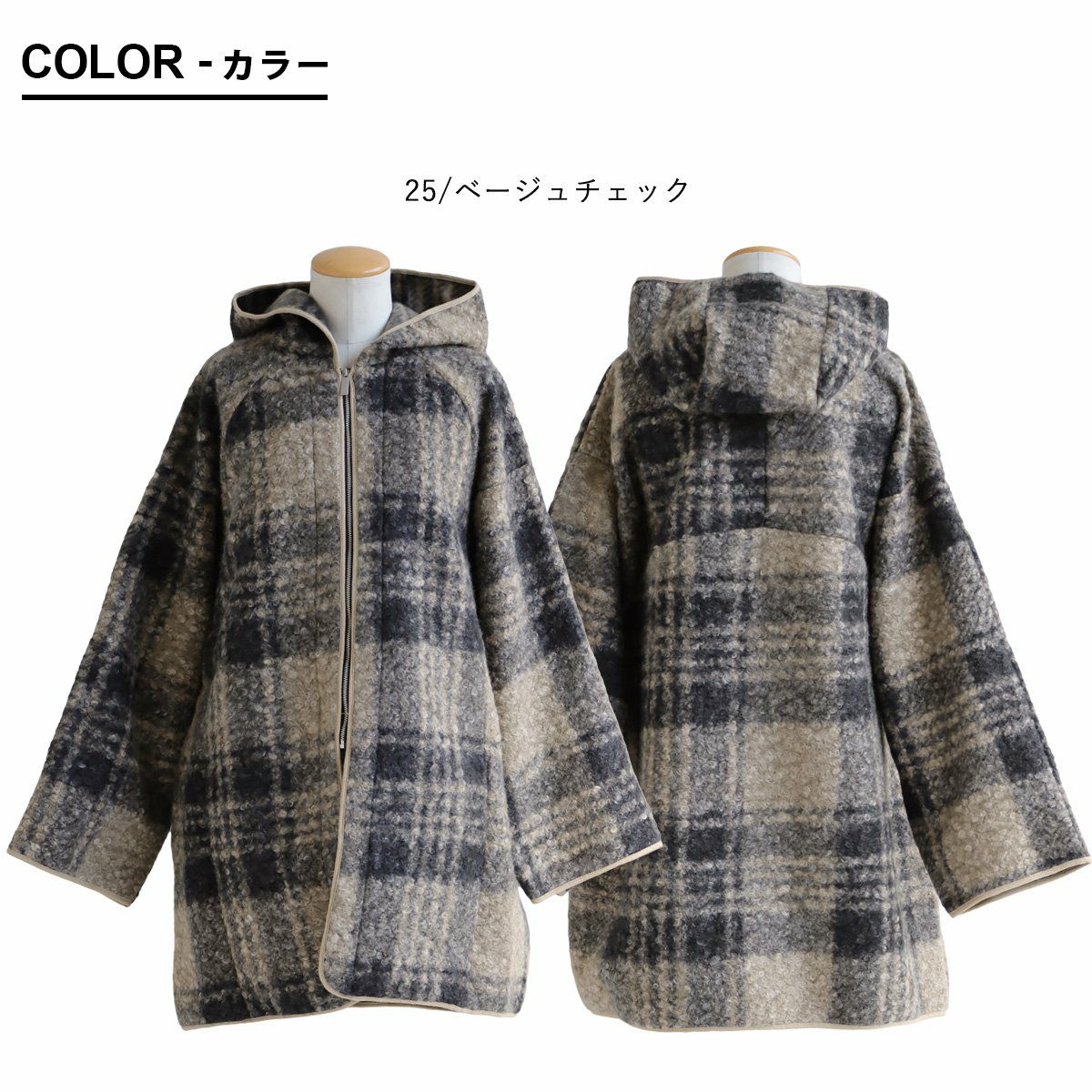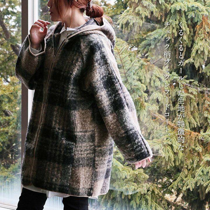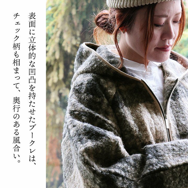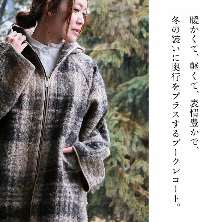 暖かくて、表情豊かで、冬の装いに奥行きを。 コート フードコート レディース フード付き チェック柄 ブークレ ポリエステル 暖かい 軽い ゆったり 大きいサイズ 体型カバー カジュアル 秋 冬 パティ le colis ルコリ