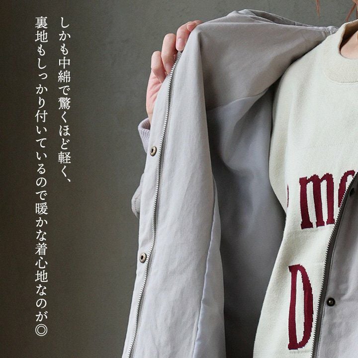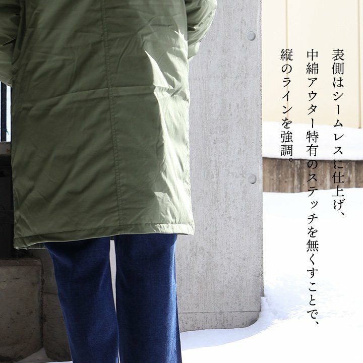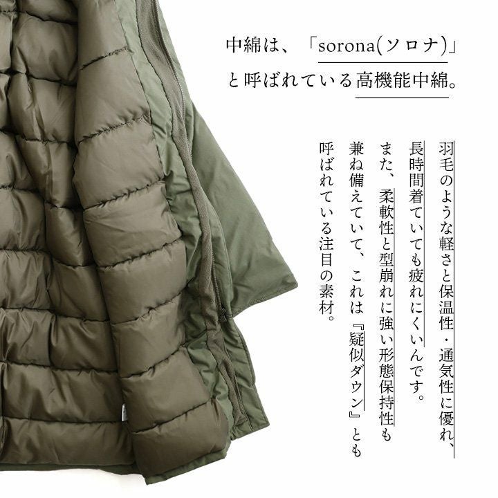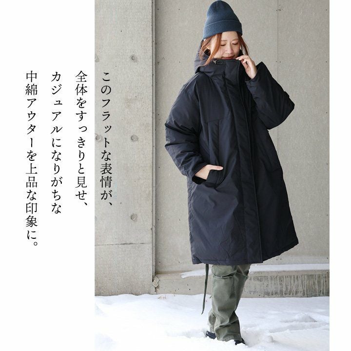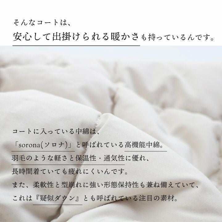 着膨れ知らずな、「疑似ダウン」。 コート ミドル丈 レディース お尻隠れる スタンドネック 無地 コットン ポリエステル 高機能中綿 sorona 暖かい 軽い 保温性 防寒 袖リブ 体型カバー すっきり 着痩せ カジュアル 秋 冬 パティ