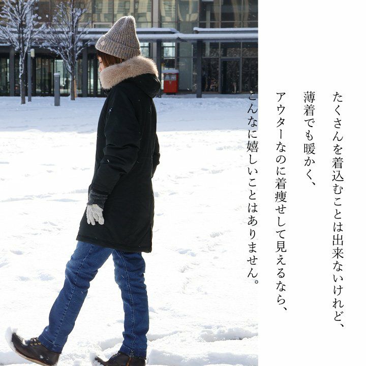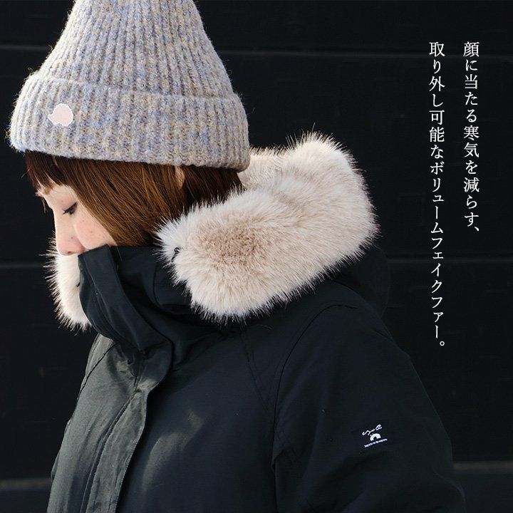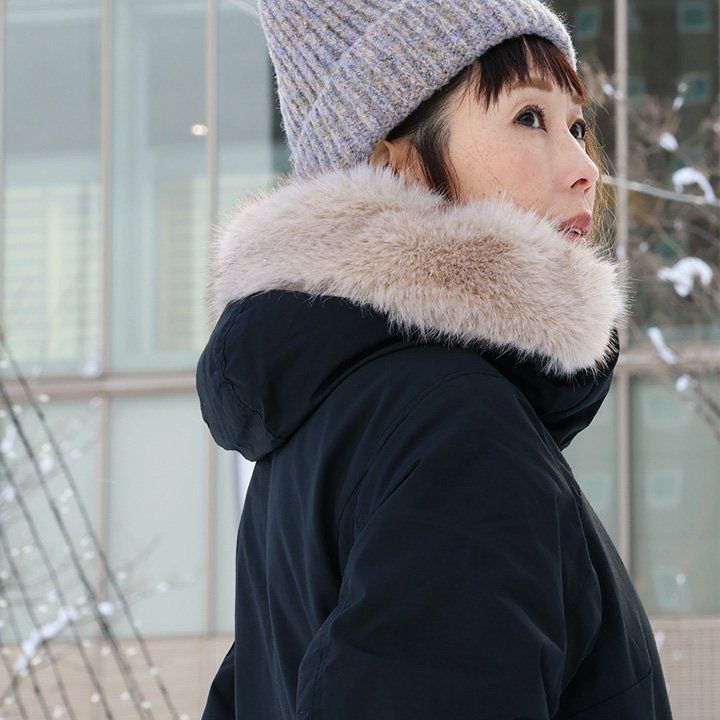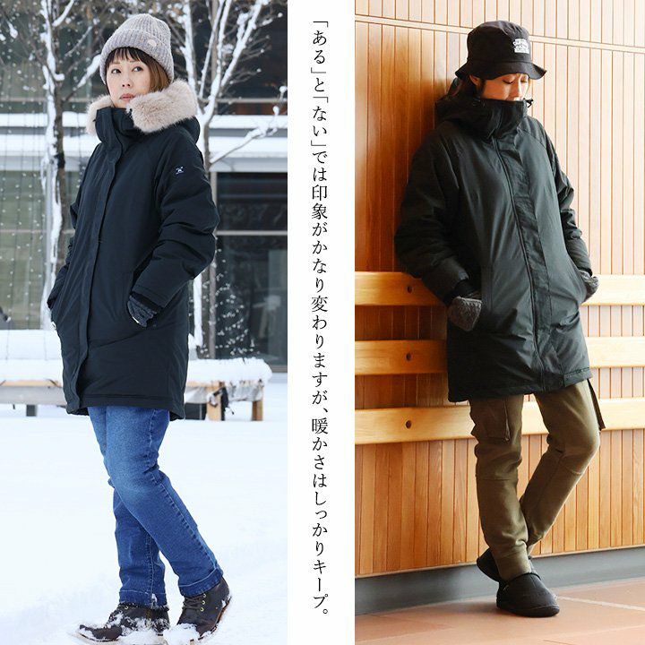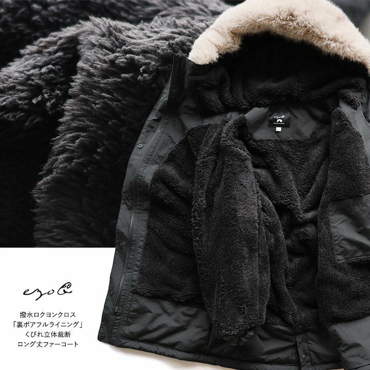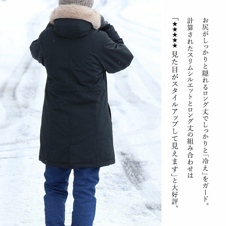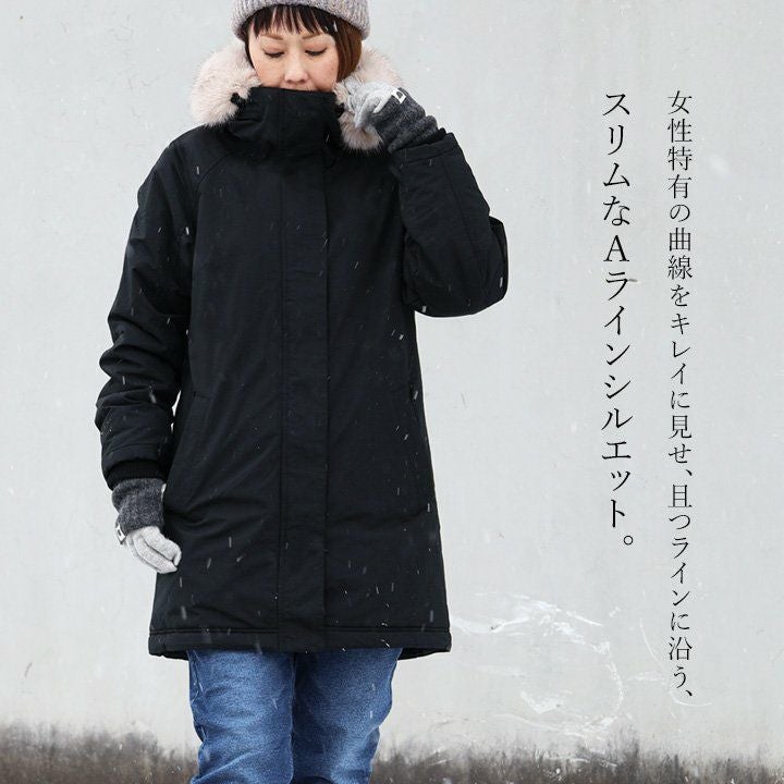 雨にも風にも寒さにも強い。スラっと「くびれ」のファーコート。 暖かい 裏ボア コート レディース 立体裁断 Aライン 細見え ダブルジップ ハイネック フード ファー付き 取り外し可 ミドル丈 撥水 防風 軽い 60/40クロス テフロン加工 内ポケット 袖リブ 袖裏ボア 大きいサイズ アウター 冬 パティ ezo& エゾト