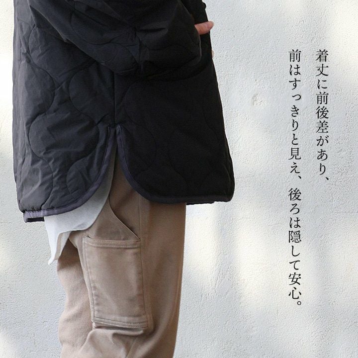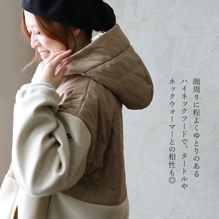 楽に羽織れるのに、「暖かくて、軽くて、すっきり」な大人が着たいジャケット。 ジャケット フード付き ミディ丈 レディース 無地 ナイロン レーヨン ツイル 中綿 キルト 裏地付き 暖かい 軽い ゆったり 体型カバー 大きいサイズ カジュアル オフィスカジュアル 秋 冬 パティ corail コライユ