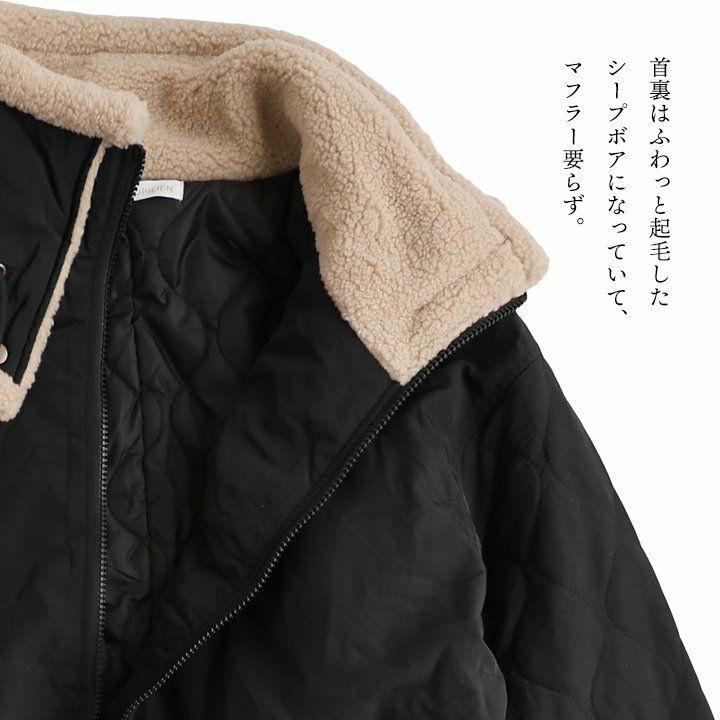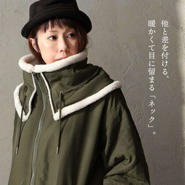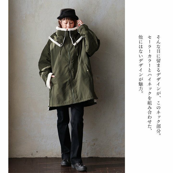他と差を付ける、暖かくて目に留まる「ネック」。 コート キルティング ミディ丈 レディース ハイネック セーラー 裏ボア 異素材切り替え ナイロン 中綿 裏地付き 暖かい 軽い ゆったり 大きいサイズ 体型カバー カジュアル 秋 冬 パティ
