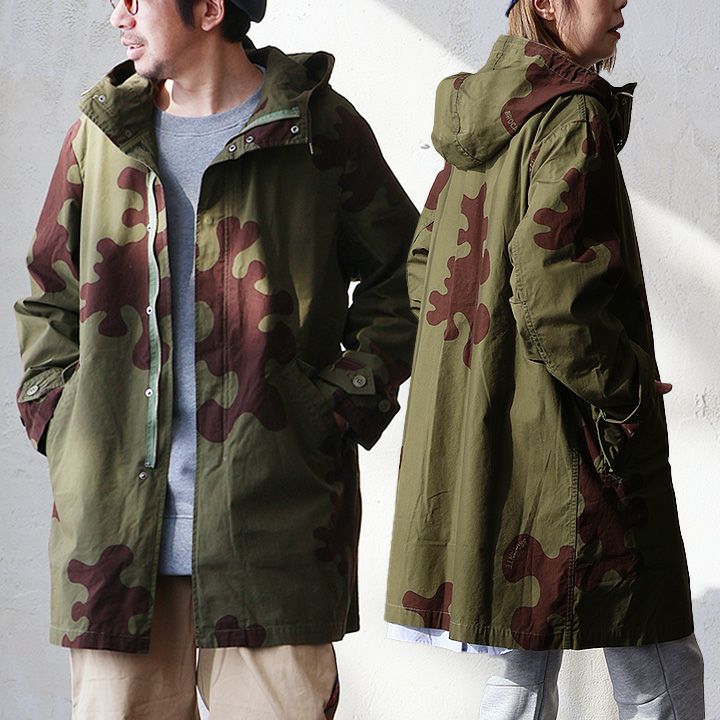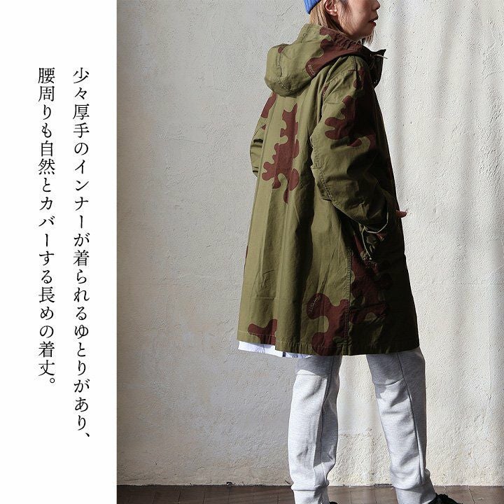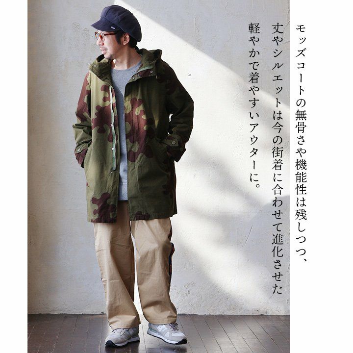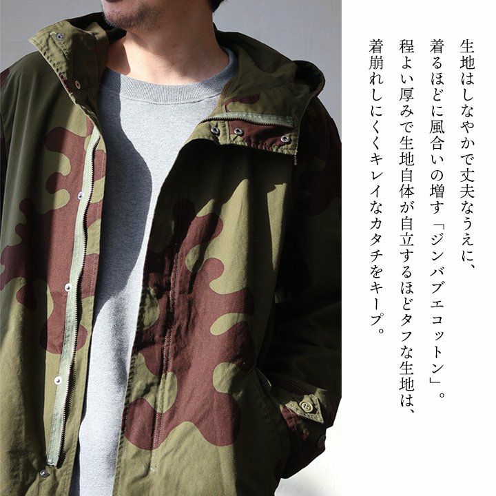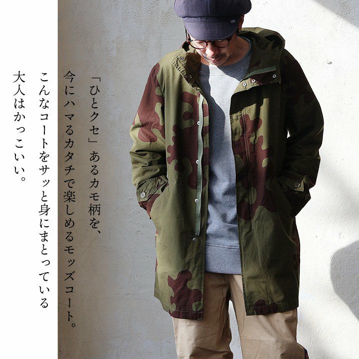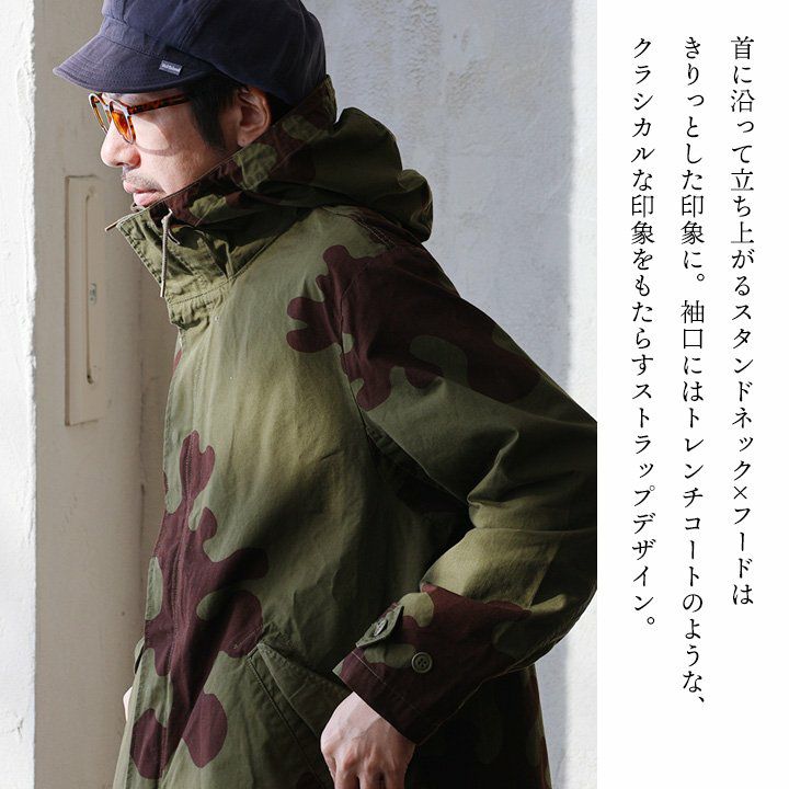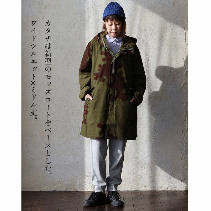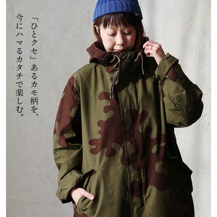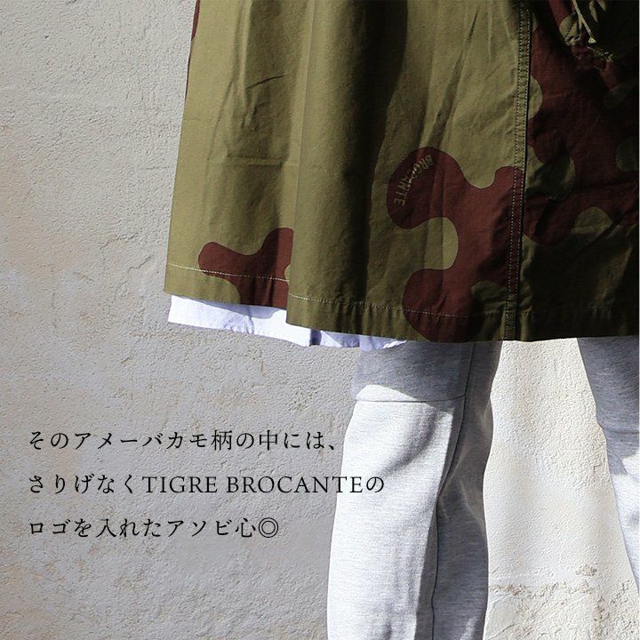 「ひとクセ」あるカモ柄を、今にハマるカタチで楽しむ。 TIGRE BROCANTE ティグルブロカンテ モッズコート ミドル丈 メンズ レディース スタンドネック アメーバカモ 総柄 ロゴ 日本製 綿100 コットン ハリ 大きいサイズ 体型カバー カジュアル ミリタリー パティ