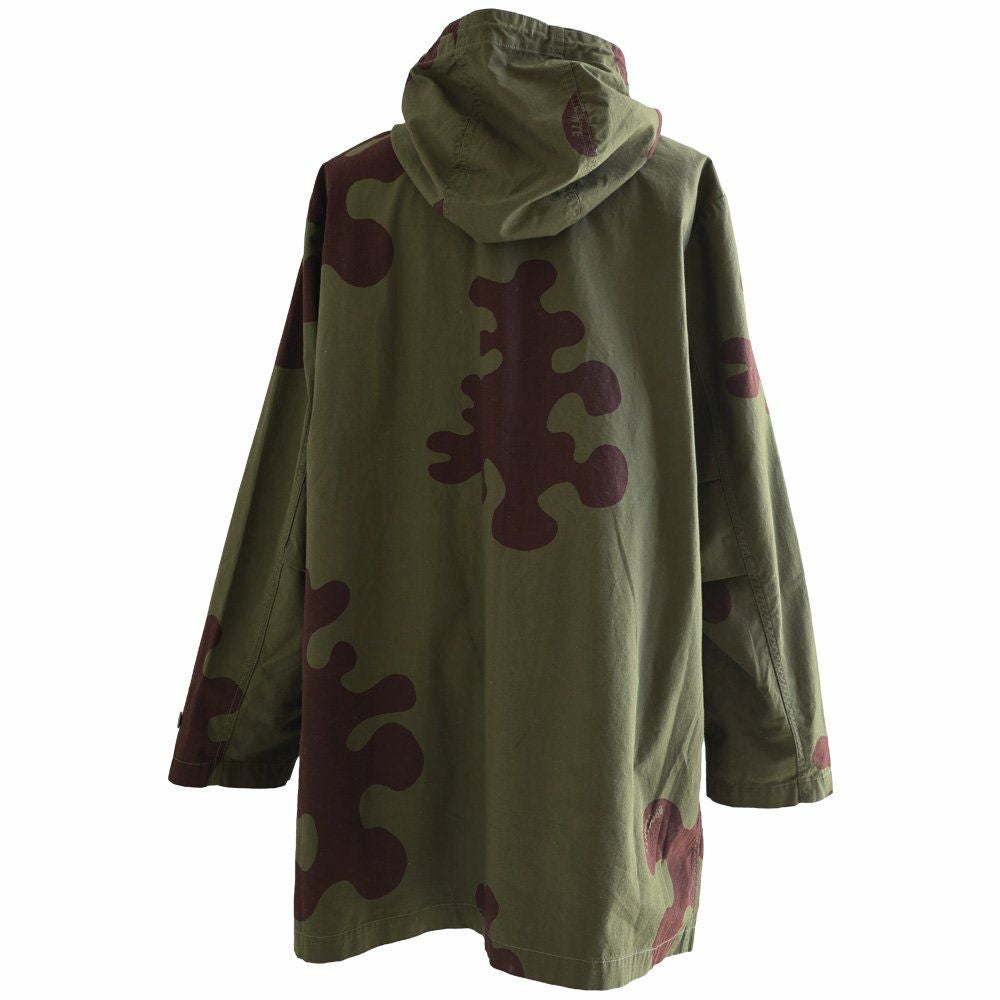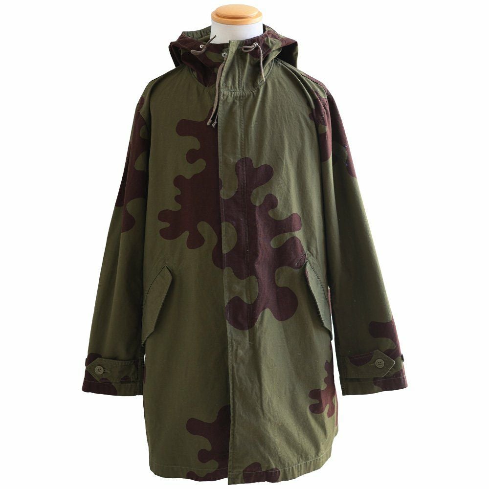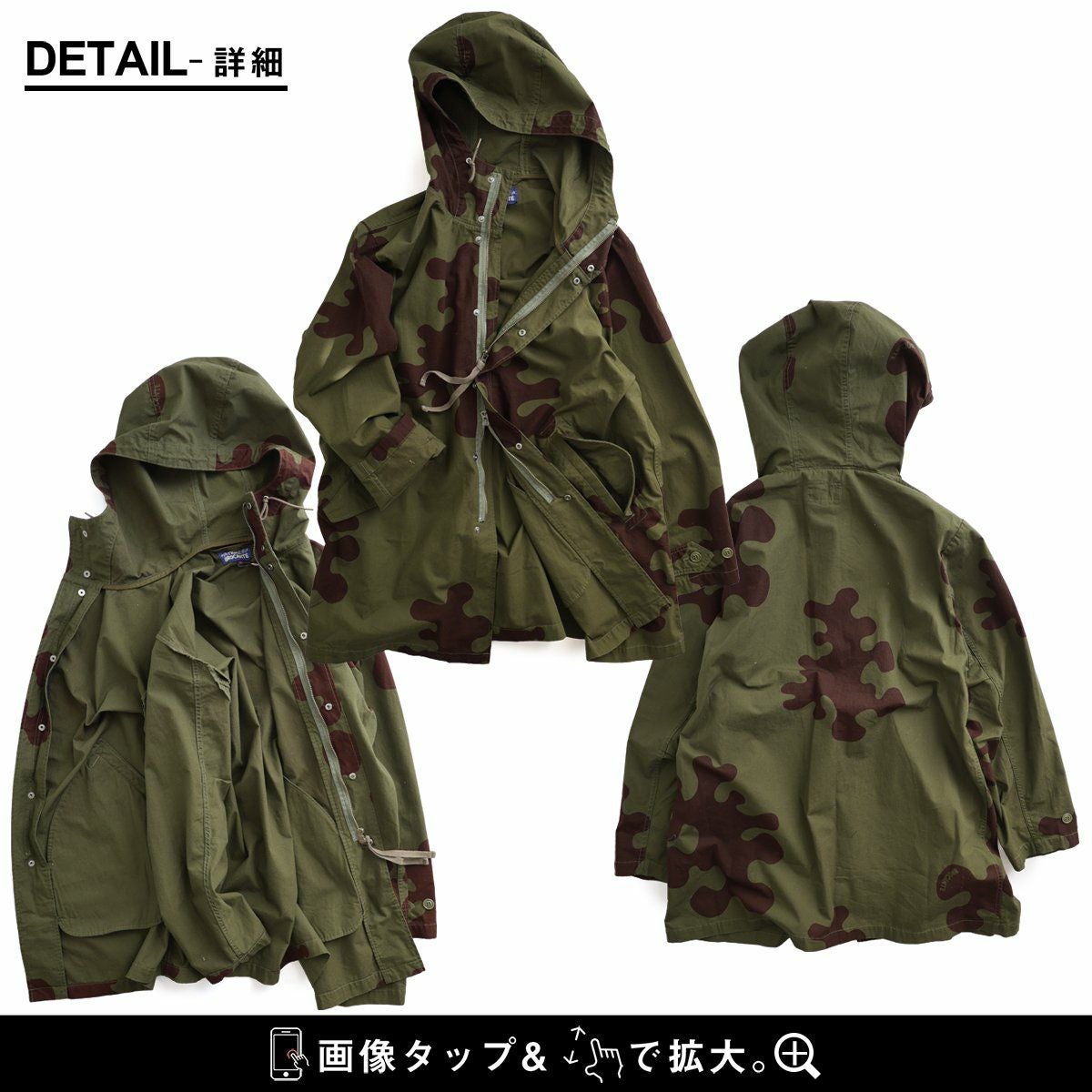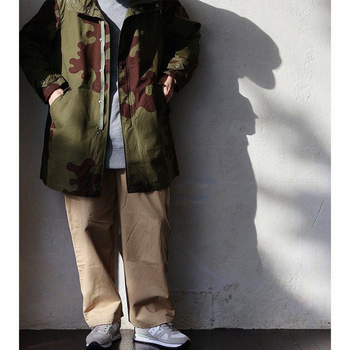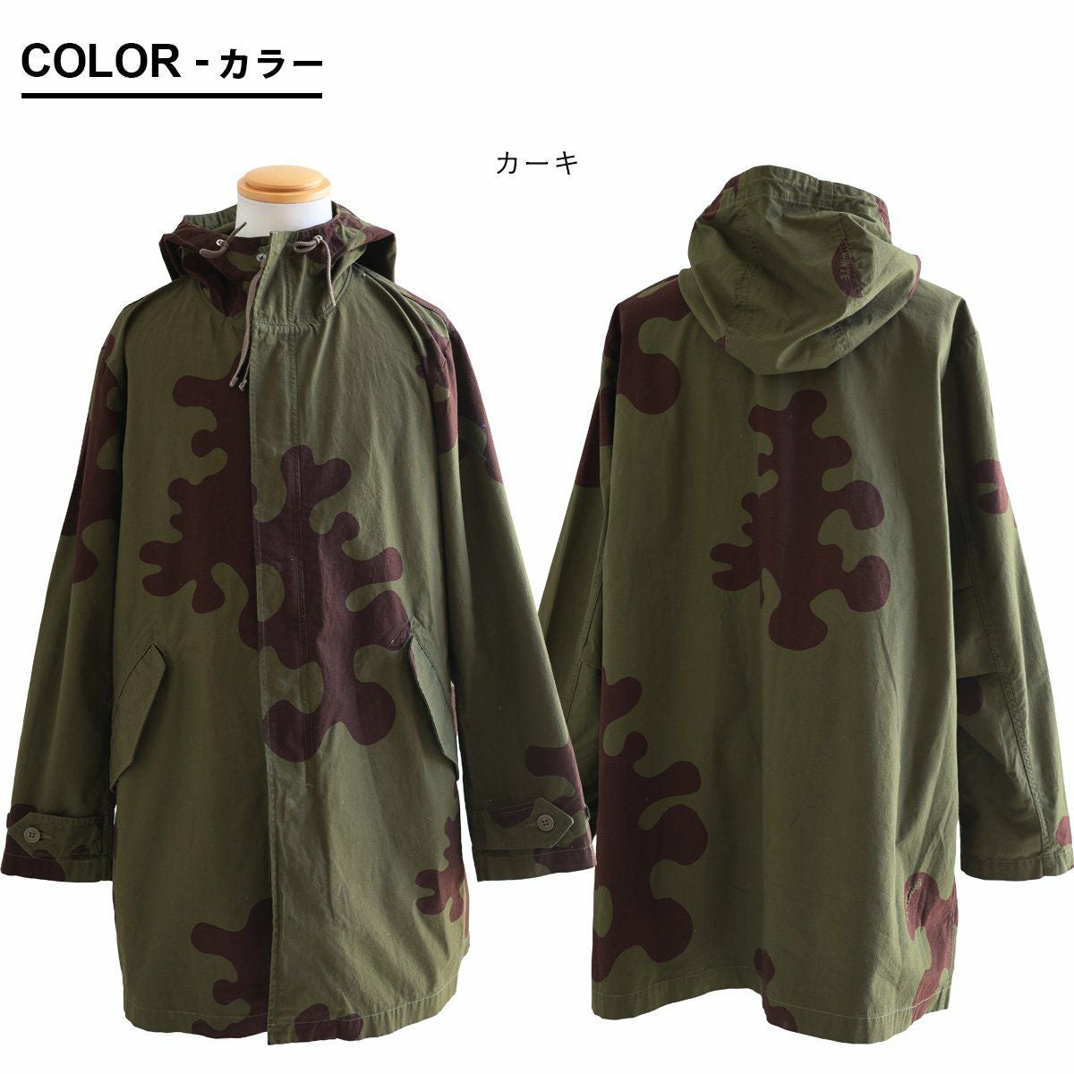 「ひとクセ」あるカモ柄を、今にハマるカタチで楽しむ。 TIGRE BROCANTE ティグルブロカンテ モッズコート ミドル丈 メンズ レディース スタンドネック アメーバカモ 総柄 ロゴ 日本製 綿100 コットン ハリ 大きいサイズ 体型カバー カジュアル ミリタリー パティ