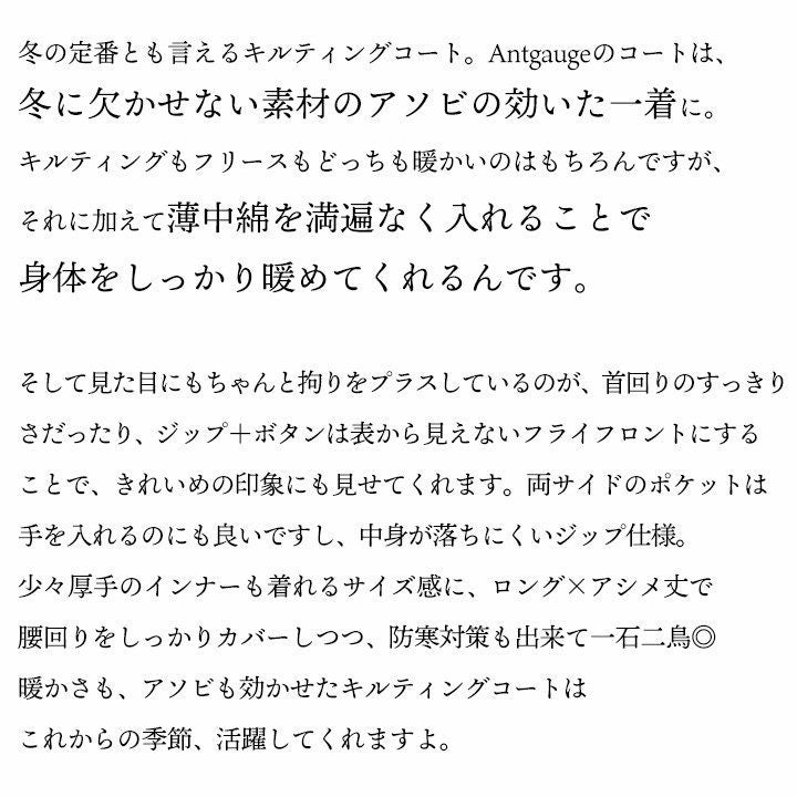 他の画像を見る 暖かさとアソビの効いた、キルティングコート。 Antgauge アウターコート キルティングコート ロング丈 レディース お尻隠れる 着痩せ 防寒 防風 薄中綿 キルティング フリース 暖かい すっきり 大きいサイズ 大人カジュアル アントゲージ 2~3日でお届け 販売価格 ¥ 33,000 税込 在庫切れ カートに入れる お気に入りに登録する