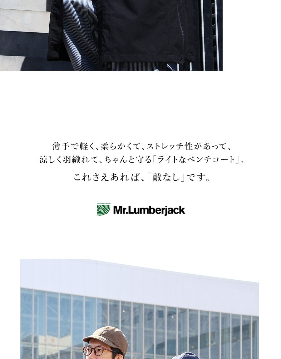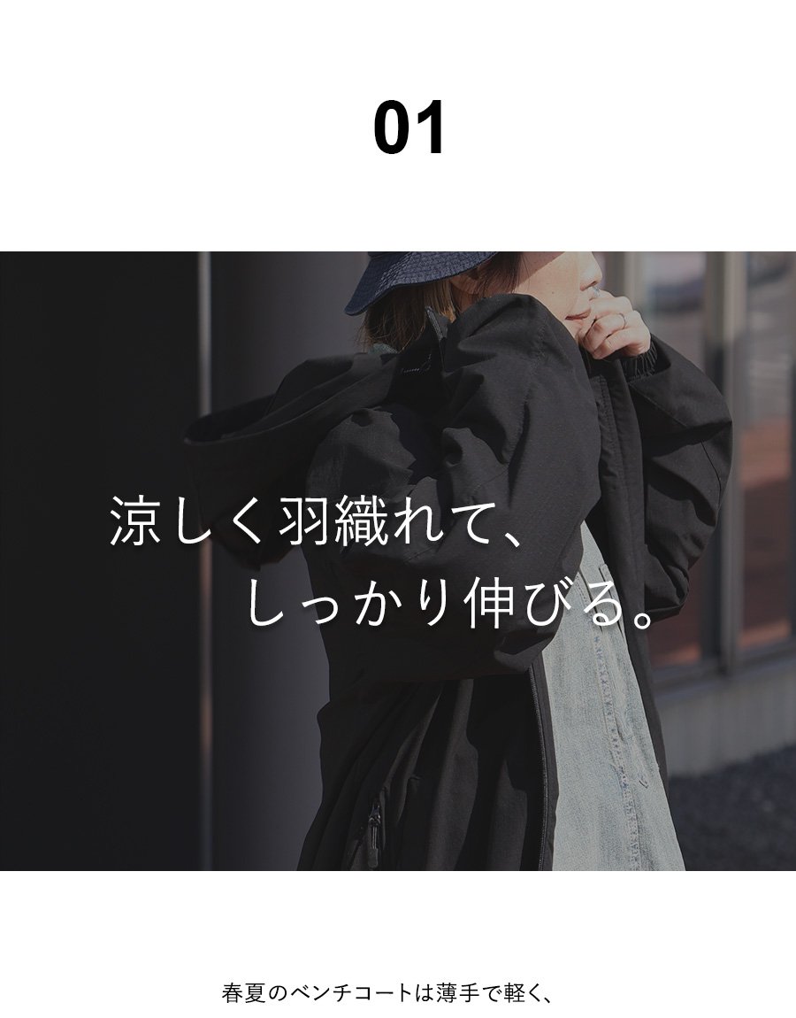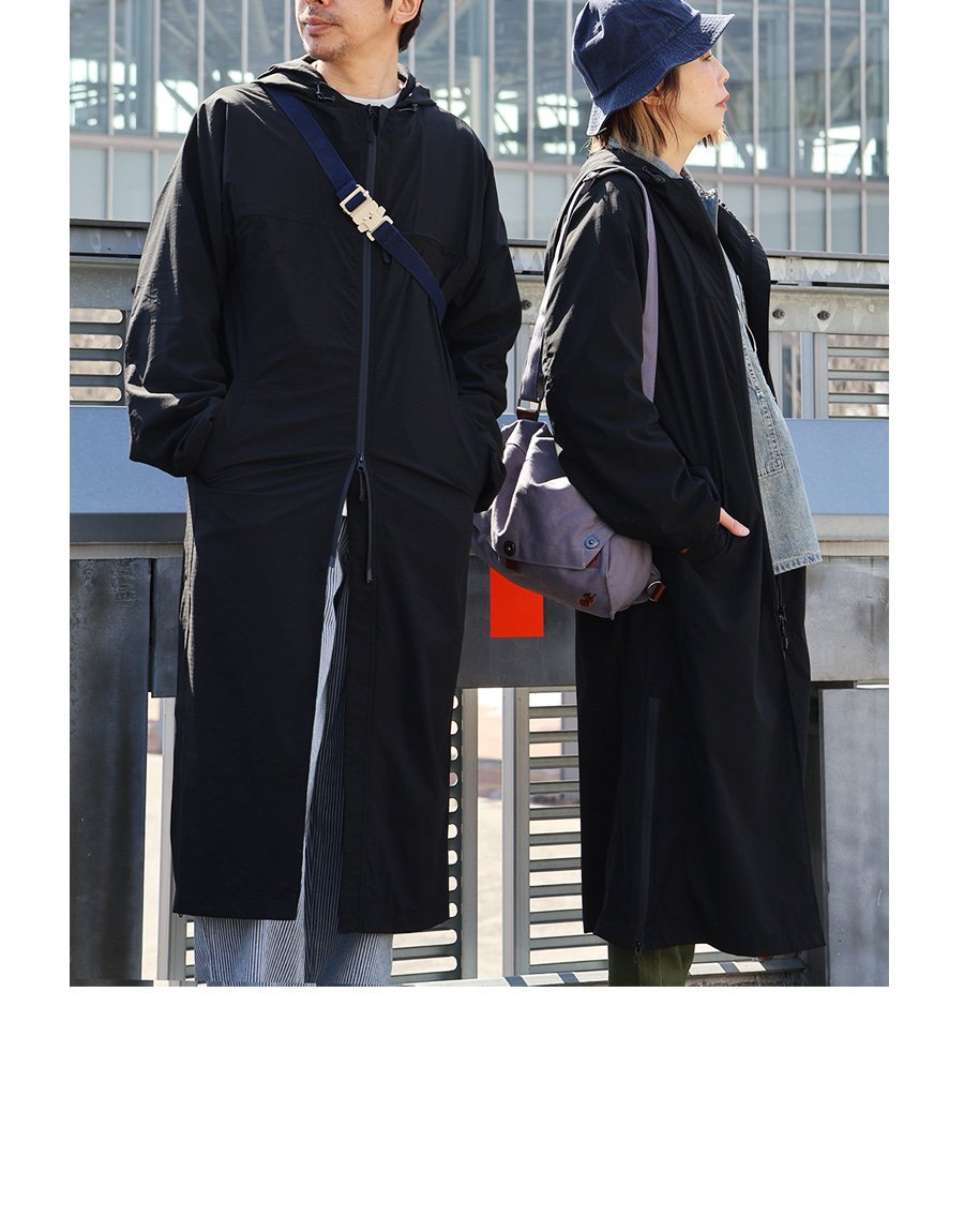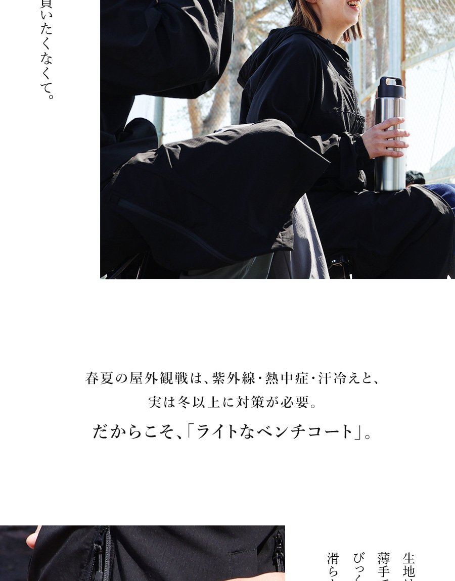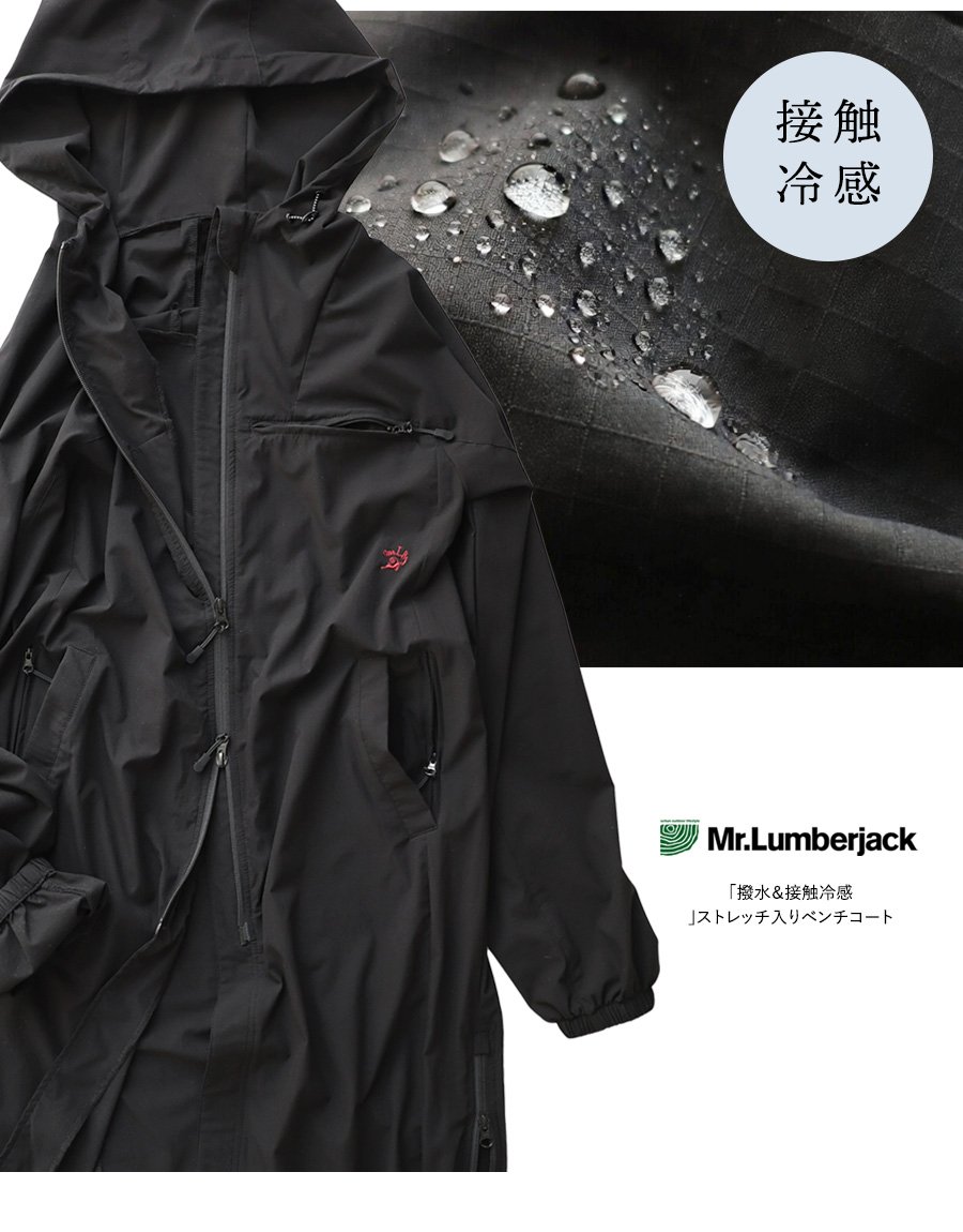 涼しく羽織れて、ちゃんと守る。 ベンチコート 涼しい メンズ レディース 春 夏 冷感 薄手 ストレッチ ナイロン ロングコート 猫刺繍 ハイネック 袖ゴム 撥水 軽量 防汚 防風 家庭洗濯 ダブルジップ ダブルポケット ポケッタブル スポーツ観戦 旅行 パティ Mr.Lumberjack ミスターランバージャック