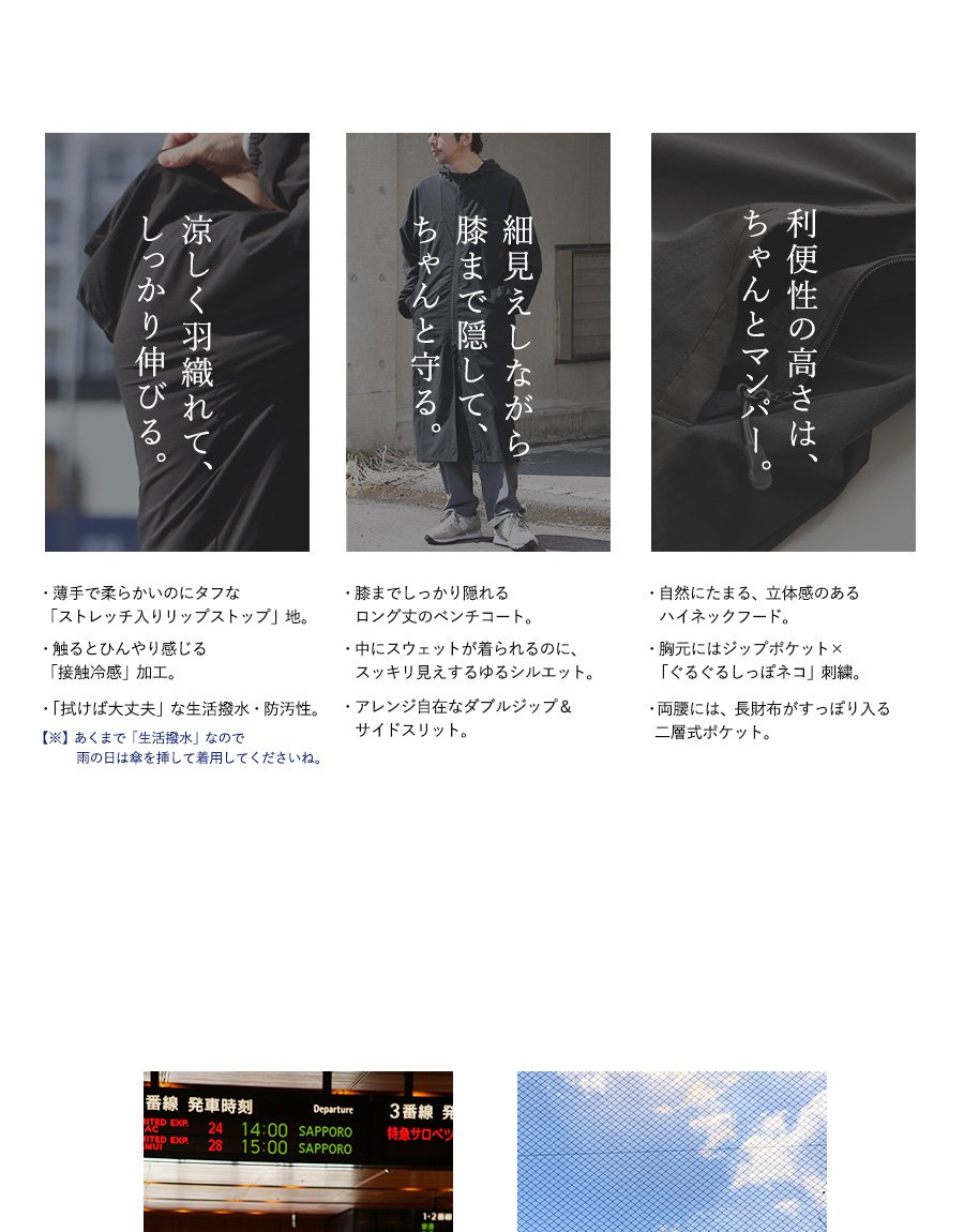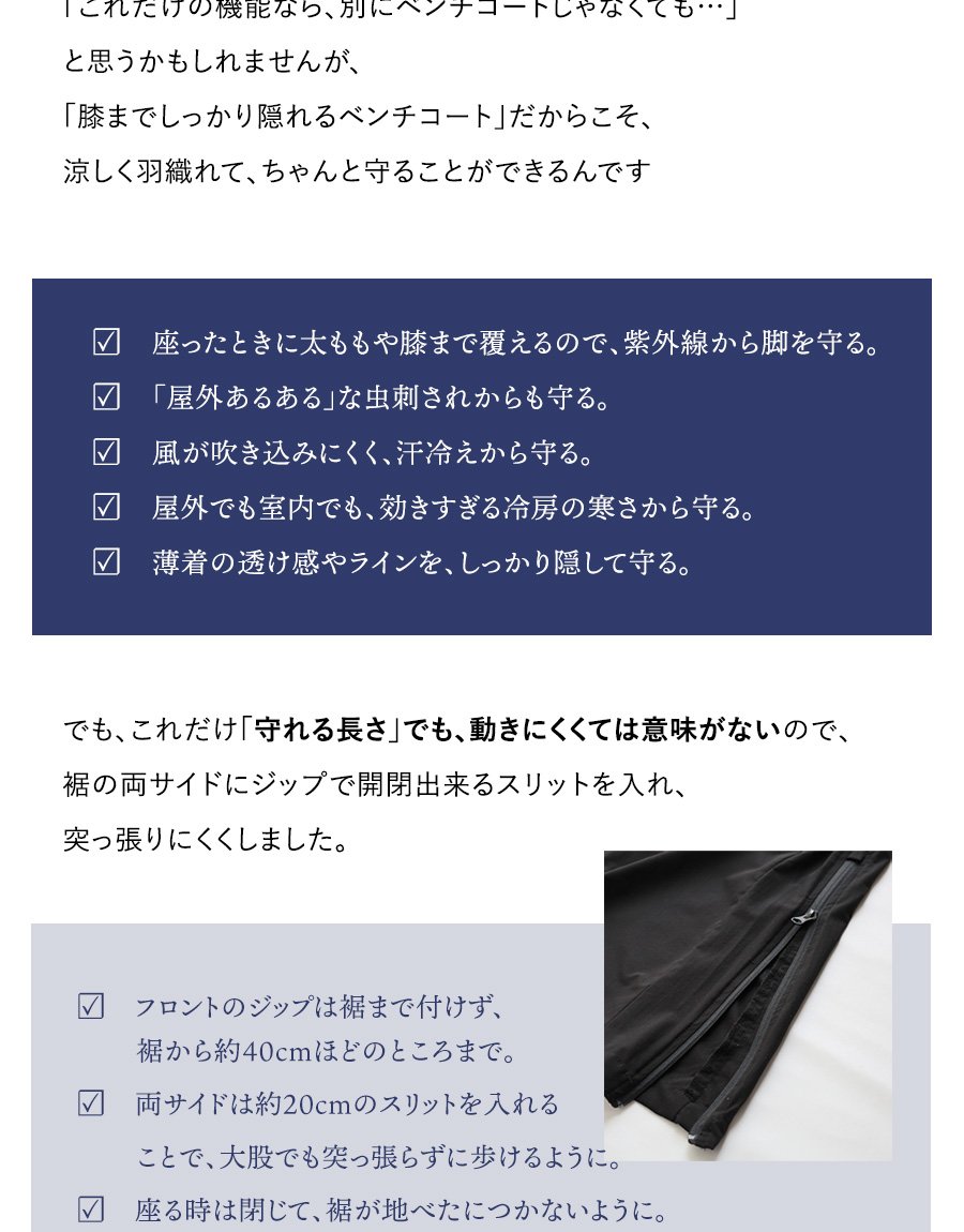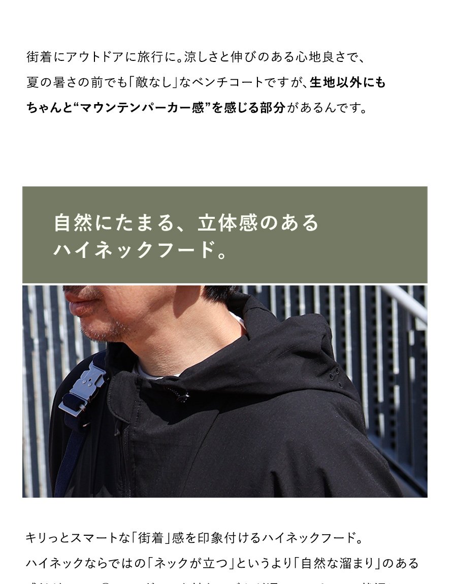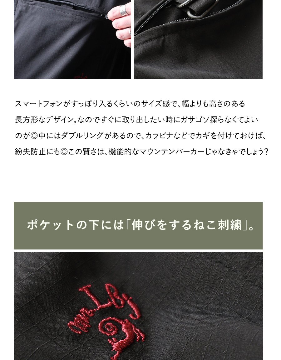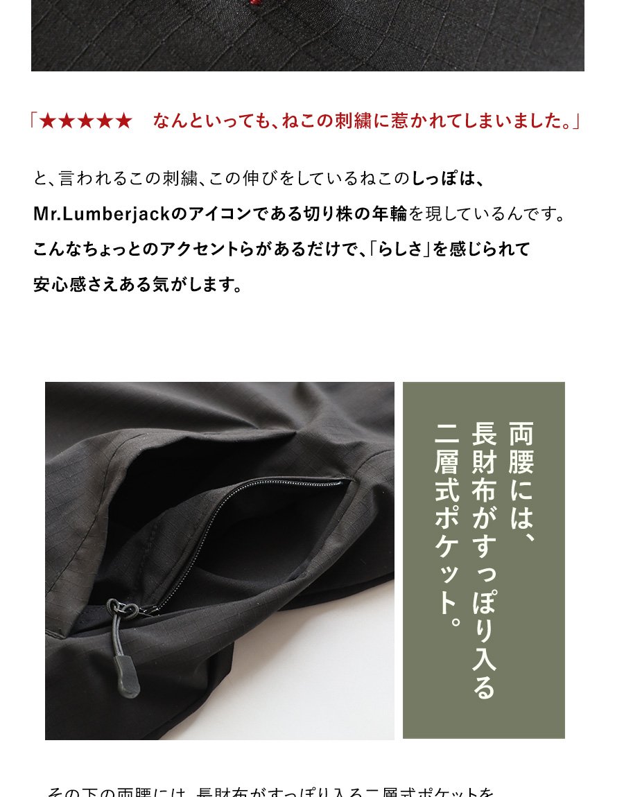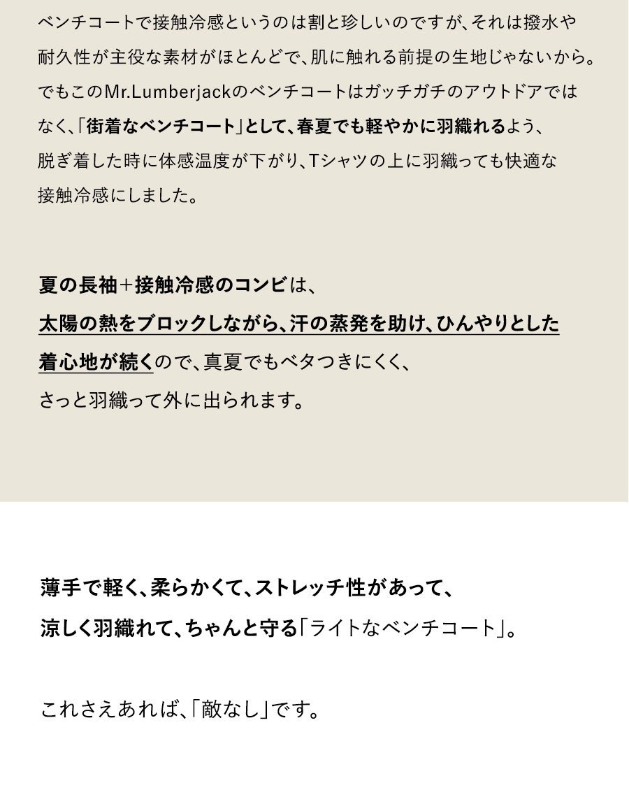 涼しく羽織れて、ちゃんと守る。 ベンチコート 涼しい メンズ レディース 春 夏 冷感 薄手 ストレッチ ナイロン ロングコート 猫刺繍 ハイネック 袖ゴム 撥水 軽量 防汚 防風 家庭洗濯 ダブルジップ ダブルポケット ポケッタブル スポーツ観戦 旅行 パティ Mr.Lumberjack ミスターランバージャック