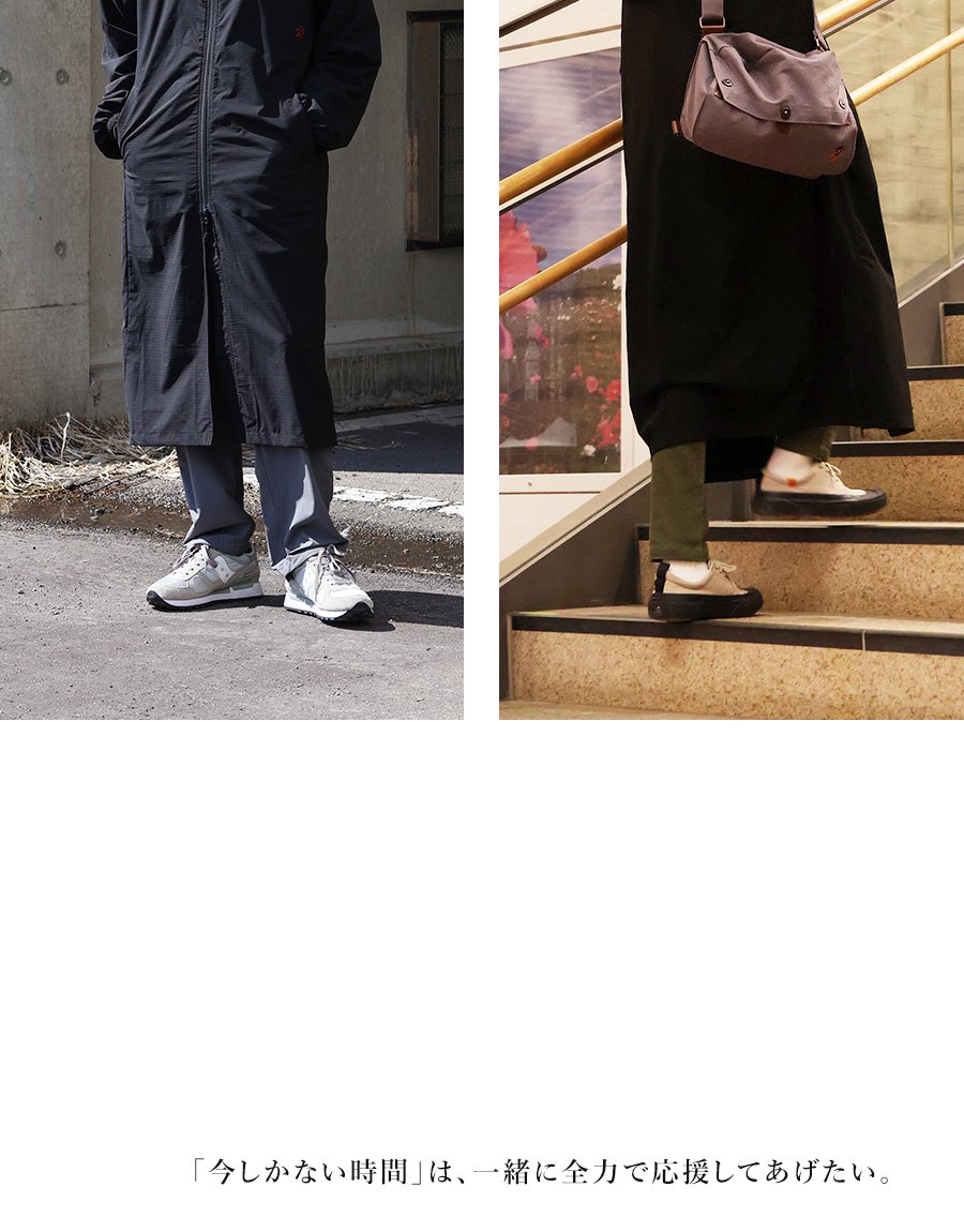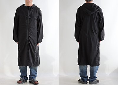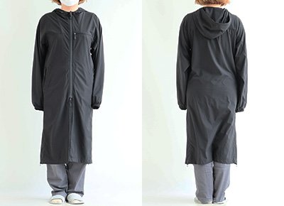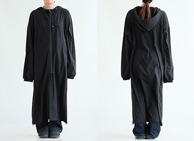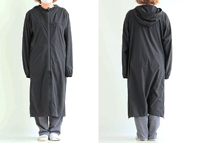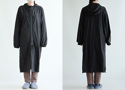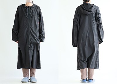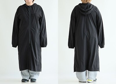 【モデルコメント】中は、カットソー2枚くらいは合わせても問題はありません。程好くゆとりがありました。 【客観的コメント】ふくらはぎが半分くらい隠れる着丈の長さです。バランスの良いシルエットで着れていましたね。