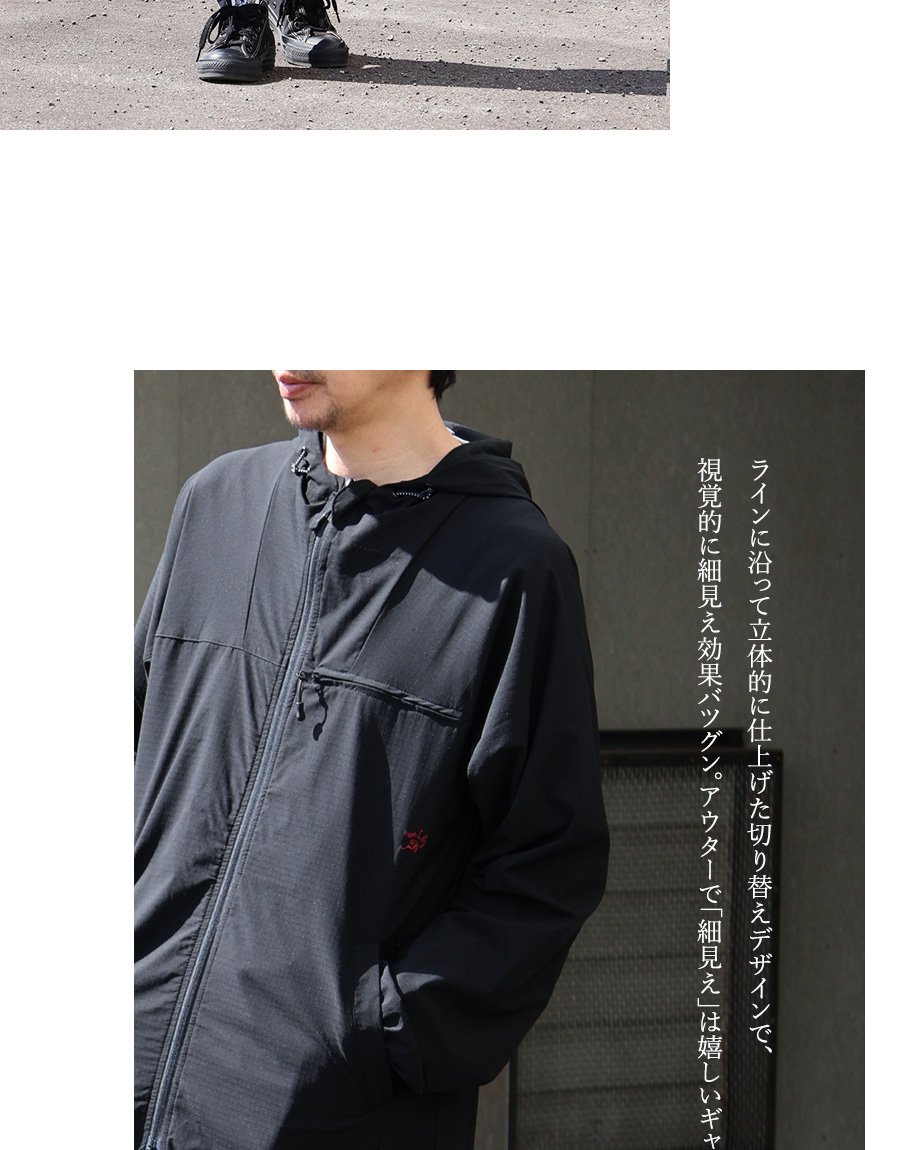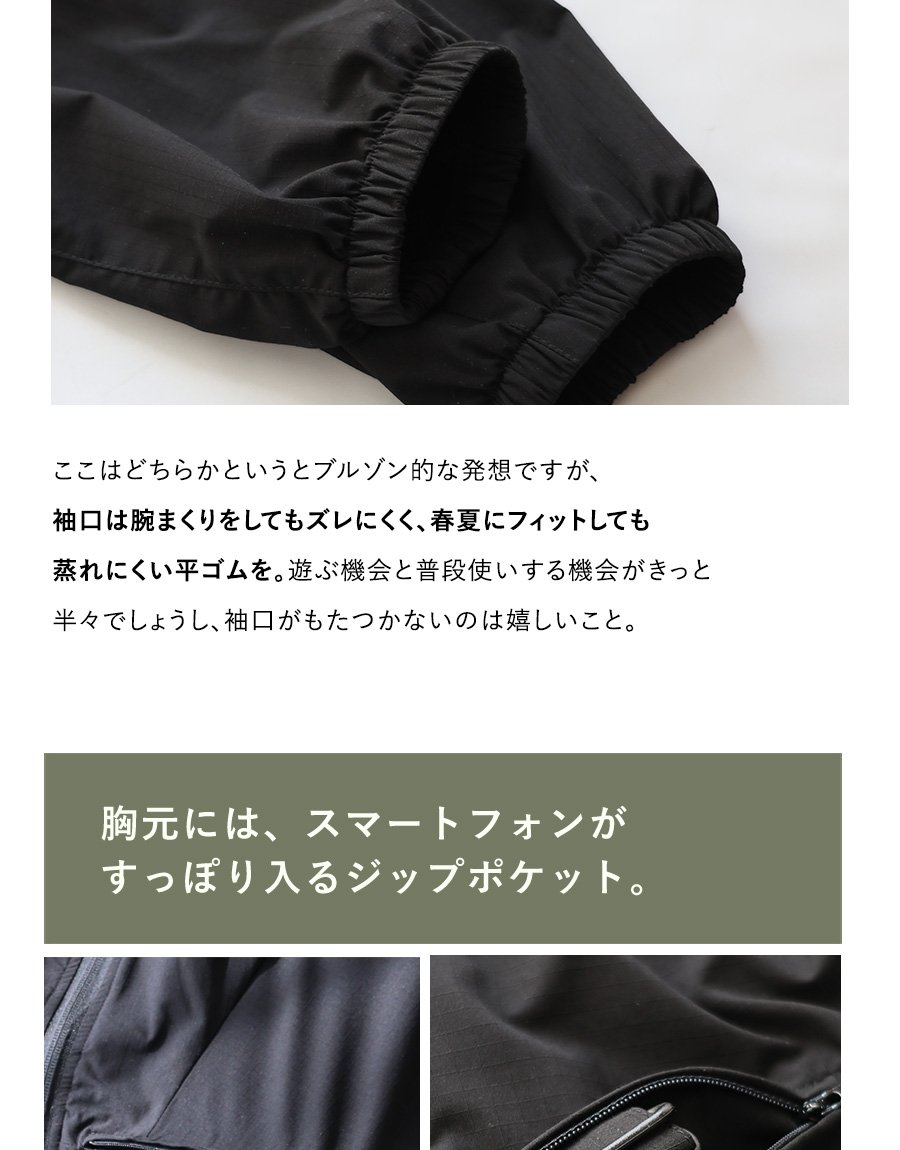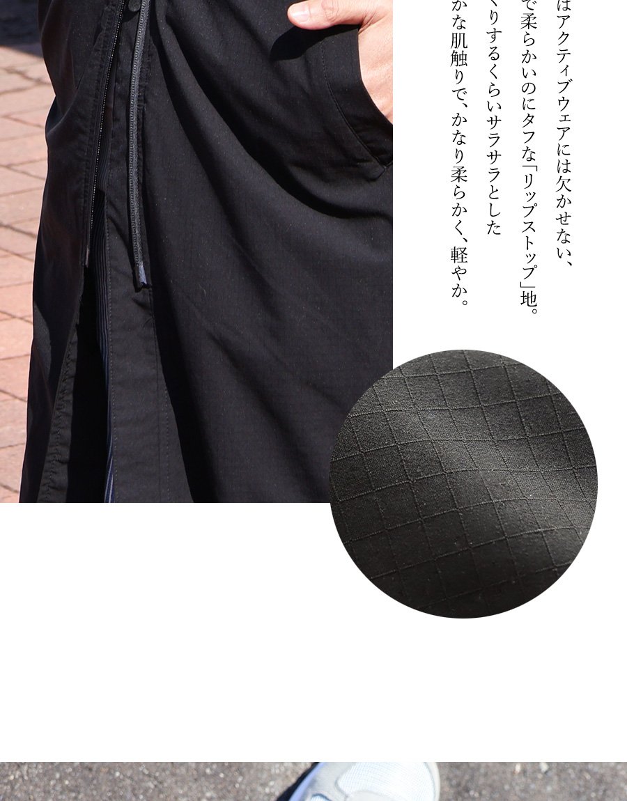 本体:薄手でサラッとした質感で柔らかく、かなり軽やかなリップストップ地。横・斜め方向に伸びて戻る充分なストレッチ性があり、光にかざすと透け感があります。