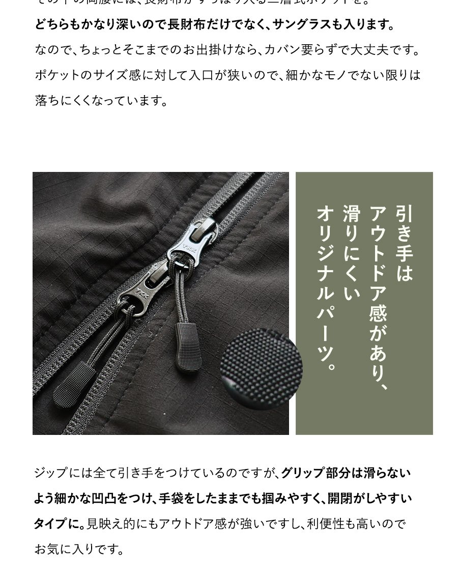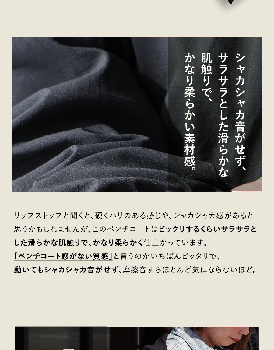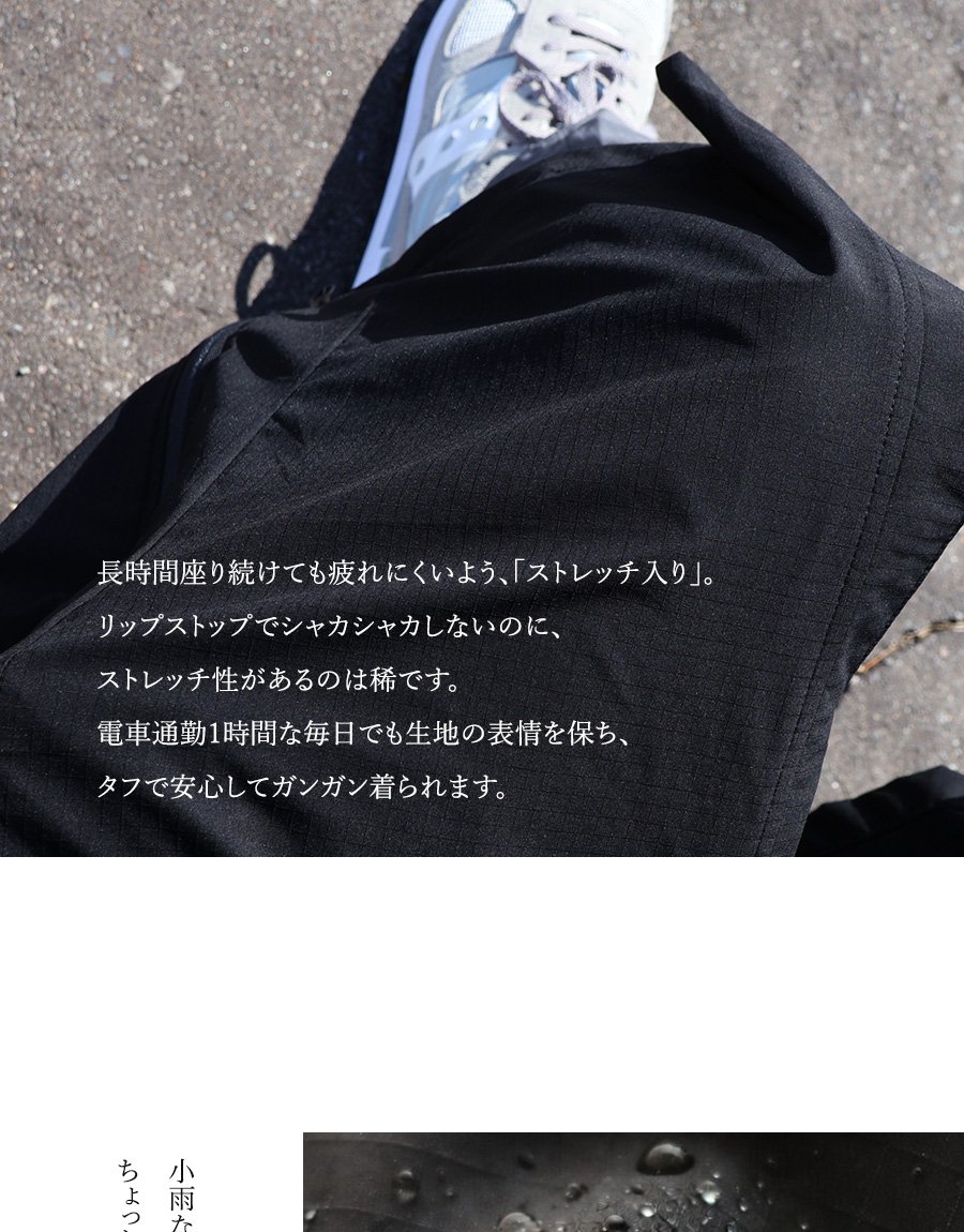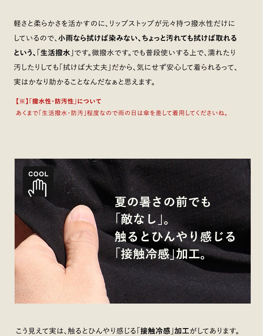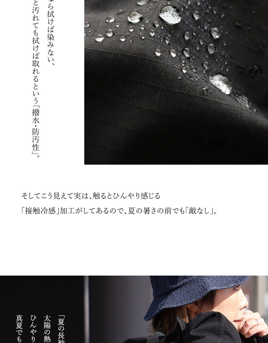 【※】永久的ではありませんが撥水加工がしてあります。過度の水洗いやクリーニングを繰り返すことで、効果が薄れてくる場合があります。その際は、再加工をクリーニング店にお願いしたり、撥水スプレーを用いていただければと思います。