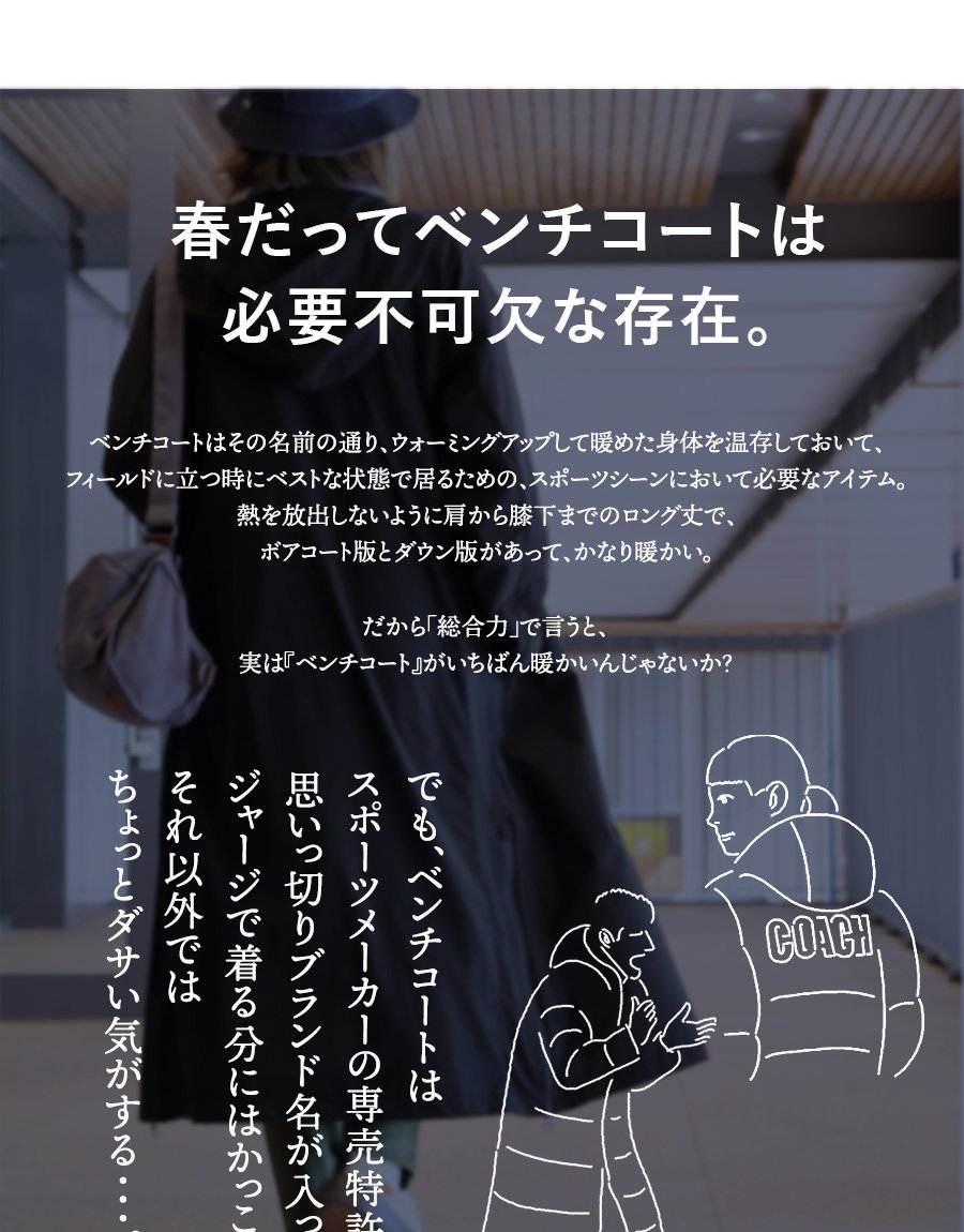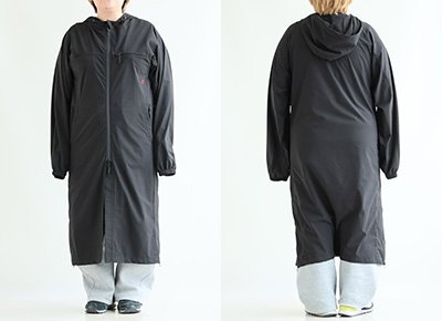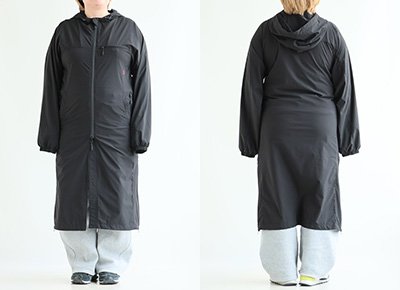 【モデルコメント】中は、トレーナーも合わせやすそうです。フィット感はなく、しっかりとゆとりがあって、着るならこのサイズを選びますね。 【客観的コメント】ふくらはぎが半分以上隠れる着丈の長さです。目立ったフィット感はなかったですし、問題はありませんね。
