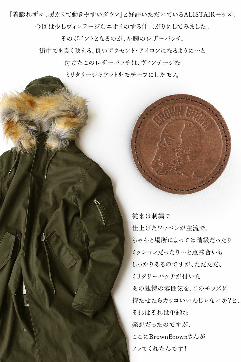 他の画像を見る 耳まで暖かくて着膨れない。【ヴィンテージ風】スリムストレッチコート。 (ブラウンブラウン×アリステア) BrownBrown×ALISTAIR モッズコート ストレッチ 【限定レザーパッチ】 販売価格 ¥ 14,300 税込 在庫切れ カートに入れる お気に入りに登録する