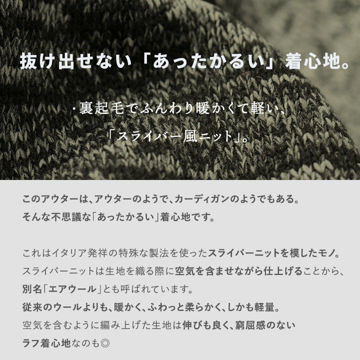 他の画像を見る 織らず、編まず、つい「羽織りたくなる」雰囲気。 ブルゾン ジャケット 長袖 メンズ レディース ランダムストライプ ニット ポリエステル 配色 ジップ 裏地付き 軽い 暖かい ゆったり 大きいサイズ カジュアル レトロ 秋 冬 パティ 2~3日でお届け 販売価格 ¥ 13,970 税込 カートに入れる お気に入りに登録する
