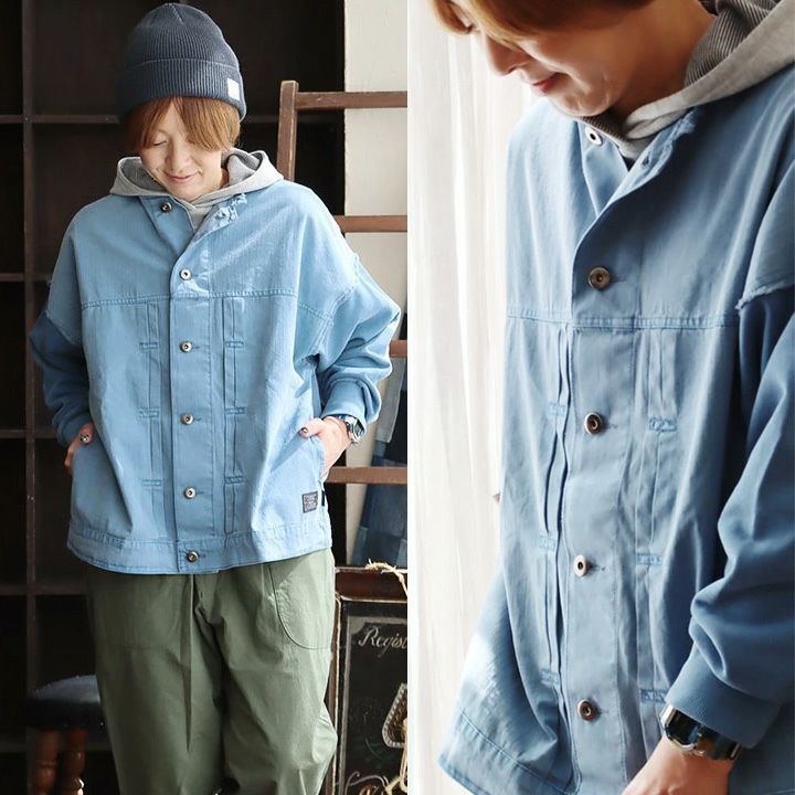 6. ブルゾン Gジャン レディース ノーカラー スタンドネック ミドル丈 大きいサイズ 無地 ワイド ジャケット 布帛 デニム カットソー 異素材切り替え お尻が隠れる ピグメント加工 褪せ色 かっこいい おしゃれ PATY パティ BLUETO ブルート