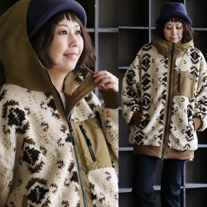 6. アウター ブルゾン 長袖 レディース ハイネック オルテガ柄 シープボア ポリエステル 軽い 暖かい 保温性 ゆったり 体型カバー 大きいサイズ カジュアル 秋 冬 パティ KAKELA&TRANQUIL カケラ&トランクイル