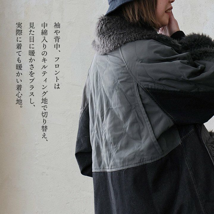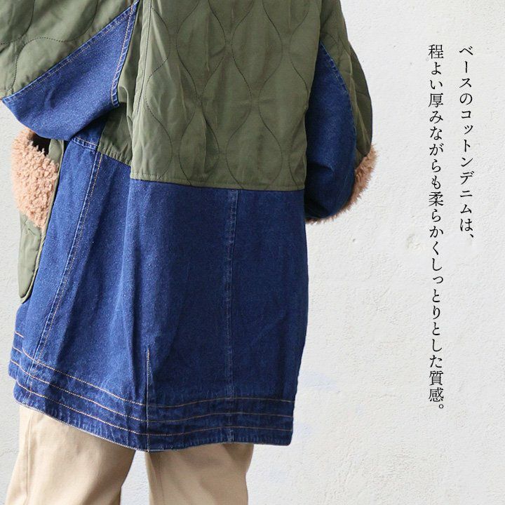 着るだけで冬が楽しくなる、暖か個性派ジャケット。 ジャケット 長袖 レディース 異素材切り替え デニム 中綿 キルト 裏地付き 配色 暖かい 袖リブ ゆったり 体型カバー カジュアル 秋 冬 パティ