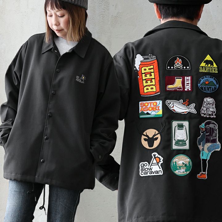 背中で語る「アウトドア好き」。 go slow caravan ゴースローキャラバン コーチジャケット 長袖 メンズ レディース ワッペン 配色 ポリエステル しっかり生地 裏地付き ハリ 大きいサイズ 体型カバー カジュアル アウトドア パティ