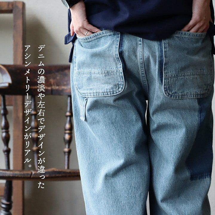 個性を出すなら、本格デザインとねこ刺繍の「ギャップ」。 デニムパンツ ストレート ワイド レディース やんのか 猫 ねこ ネコ 刺繍 リメイク風 パッチワーク 配色切り替え アシンメトリー ウエストゴム コットン 綿100 ゆったり 大きいサイズ 体型カバー カジュアル