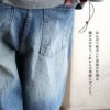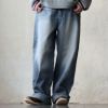 【モデルコメント】骨盤で穿きました。中は、スウェットパンツを合わせても問題はありませんね。しっかりとゆとりがあって、穿くならこのサイズが良いですね。 【客観的コメント】裾は地面に結構擦れる丈の長さです。しっかりとゆとりを持って穿きたいなら、選んでも良さそうなサイジングでしたね。