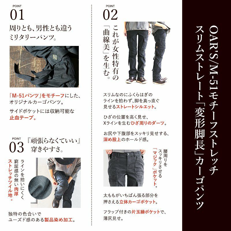 女性特有の「曲線」美。細く長く見せる、唯一無二な『マジックパンツ』。 カーゴ パンツ スリム ストレート ミリタリーパンツ 楽チン ストレッチ フレア 変形 Xライン 脚長 M-51 モチーフ 肉厚 ツイル ヴィンテージ加工 小尻 レディース カジュアル メンズライク 大きいサイズ PATY OAR’S オールズ