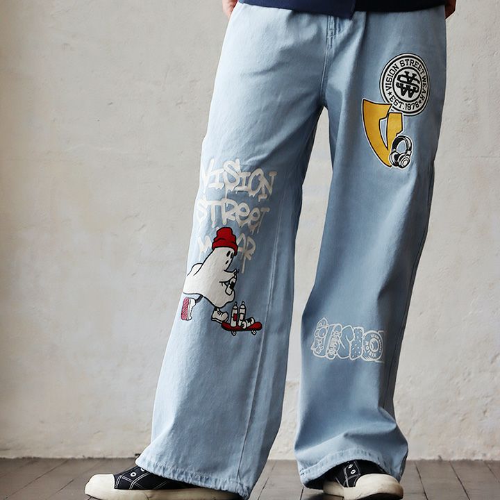 このヤンチャなプリントの犯人は一体誰? パンツ ワイド デニムパンツ ストレート メンズ レディース プリント グラフィックロゴ オバケ 綿100 コットン ノンストレッチ ロックコード 軽い 柔らか ウエストゴム ゆったり 大きいサイズ 体型カバー カジュアル パティ VISION STREET WEAR ヴィジョンストリートウェア