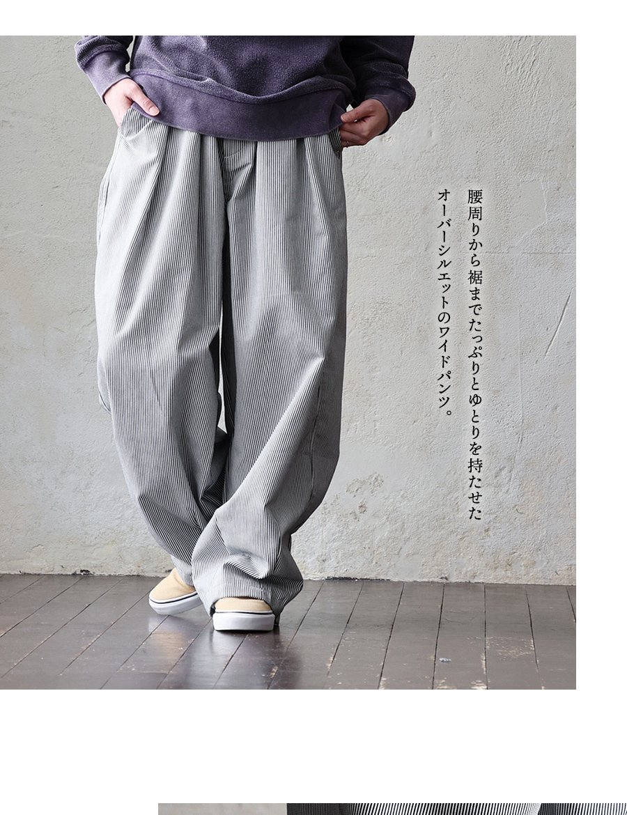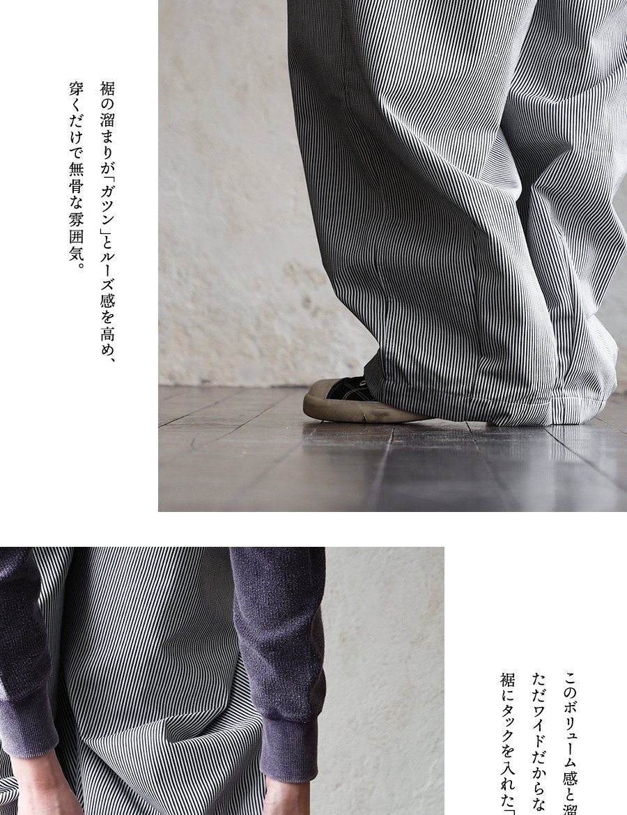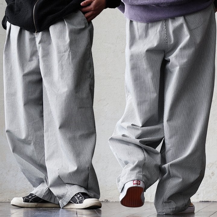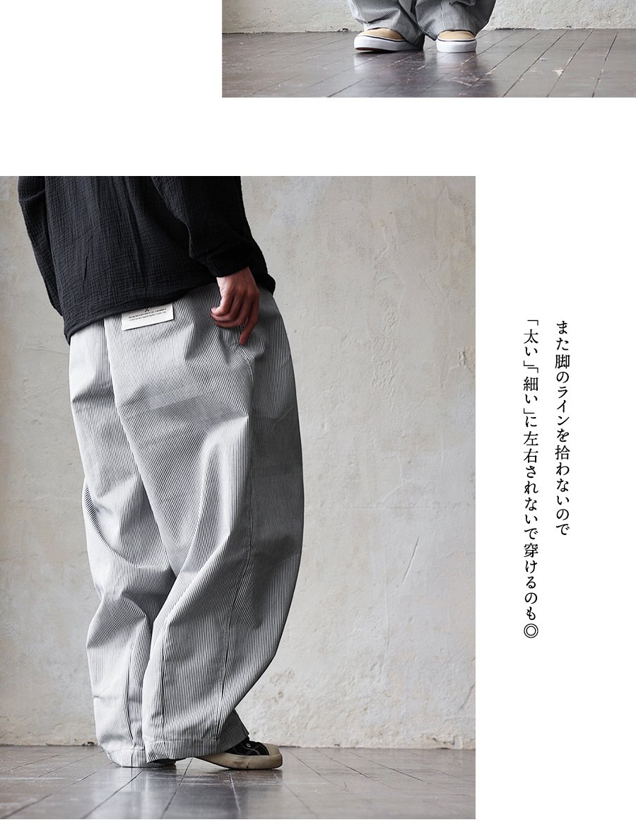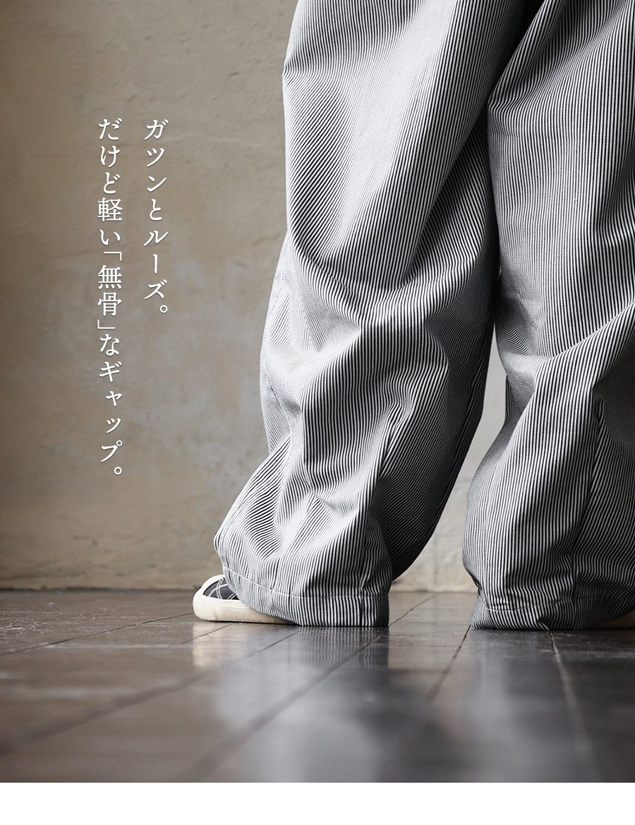 ガツンとルーズ。だけど軽い「無骨」なギャップ。 パンツ ワイド メンズ レディース タック バルーン TCツイル タフ シワになりにくい ウエストゴム ヒッコリー ストライプ カジュアル アメカジ パティ