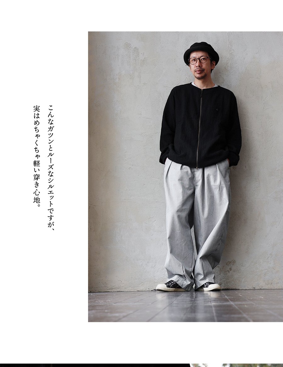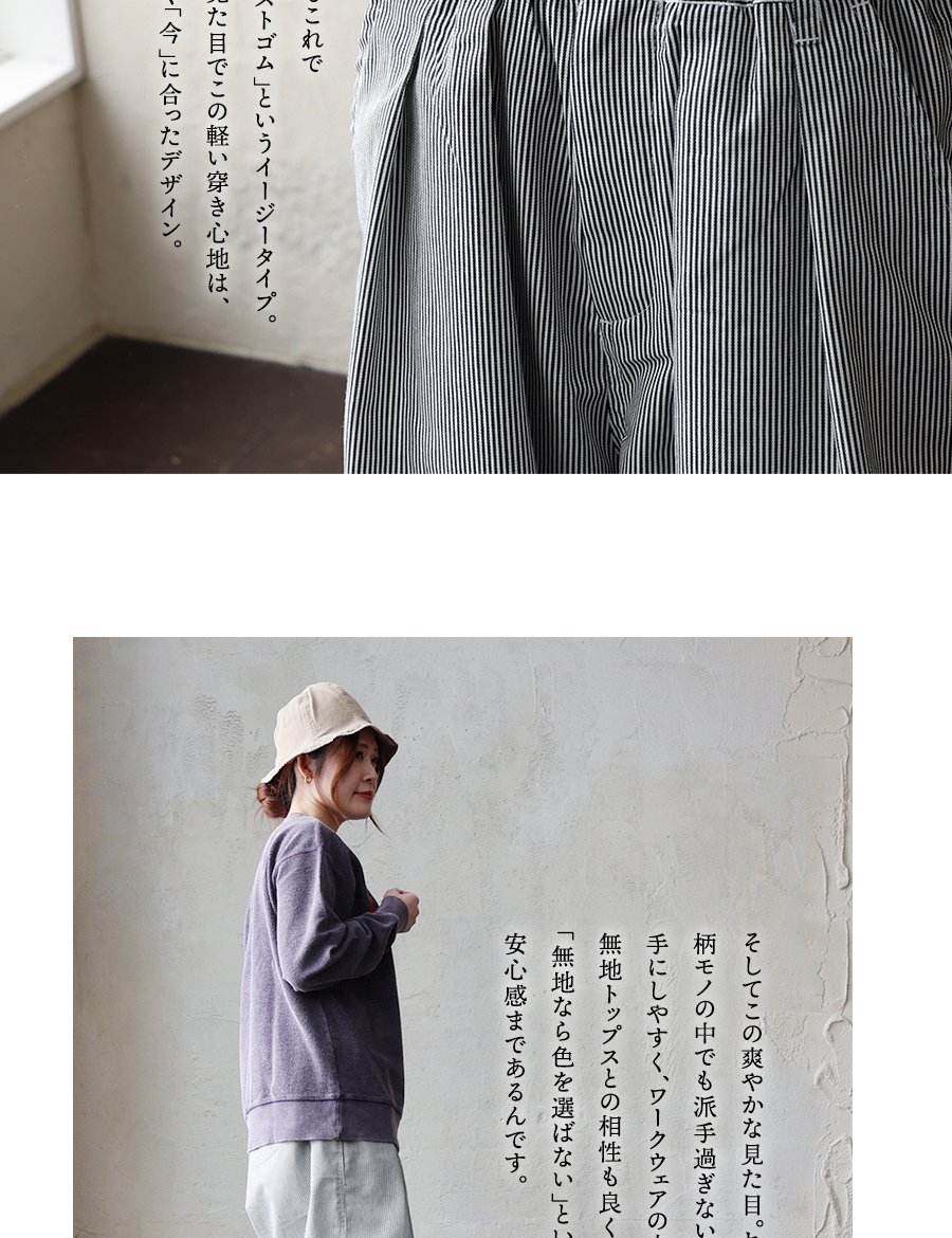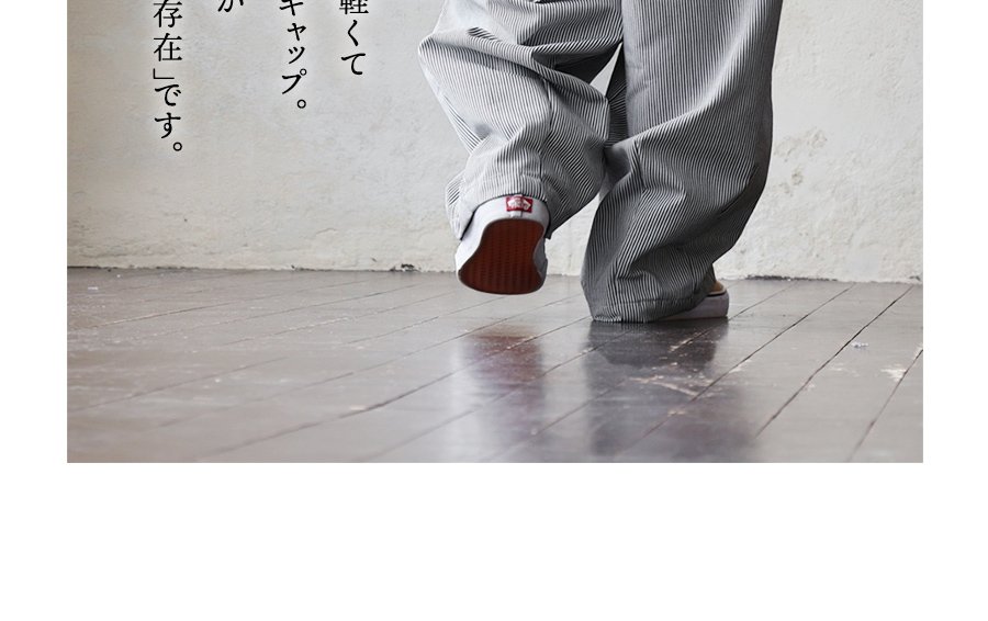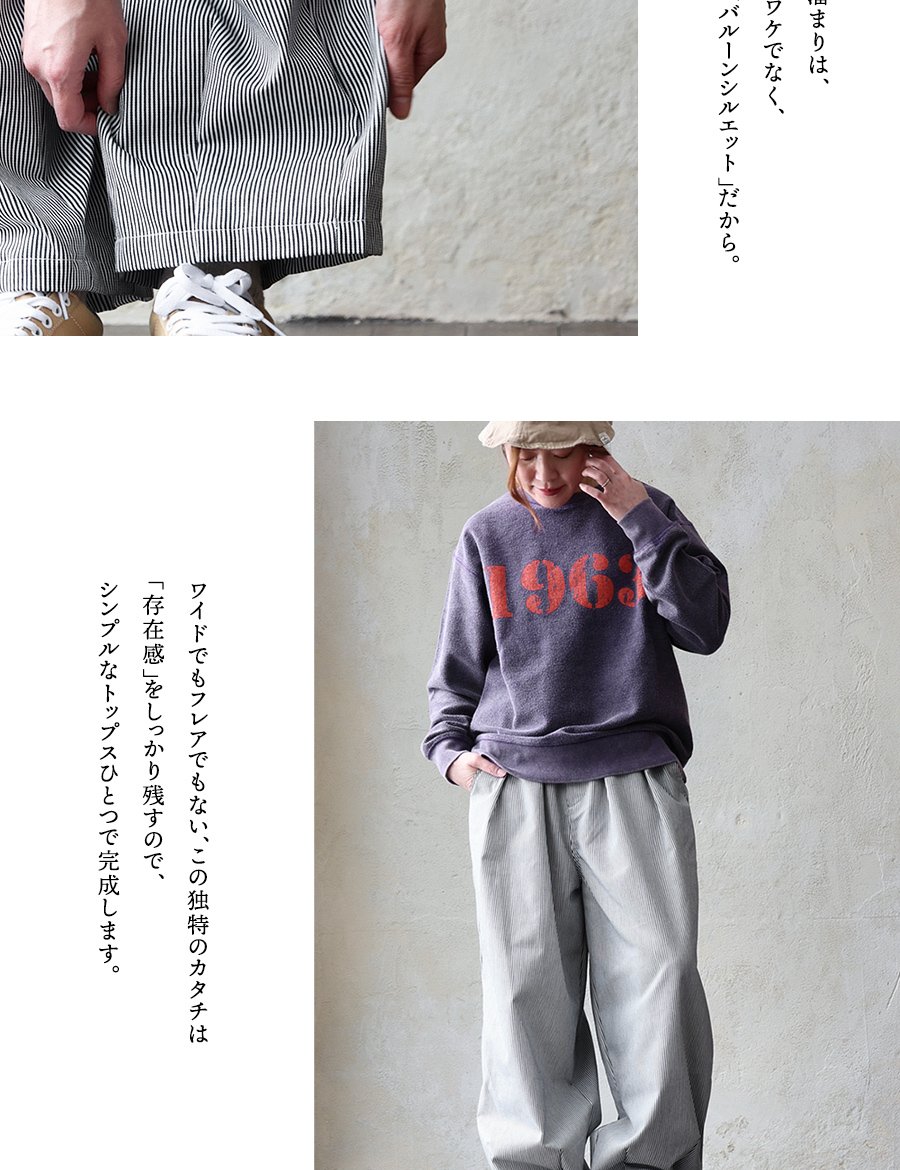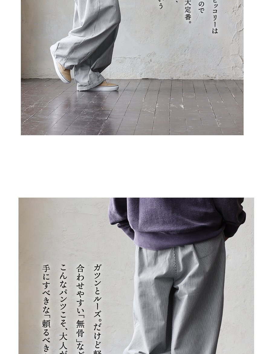 ガツンとルーズ。だけど軽い「無骨」なギャップ。 パンツ ワイド メンズ レディース タック バルーン TCツイル タフ シワになりにくい ウエストゴム ヒッコリー ストライプ カジュアル アメカジ パティ