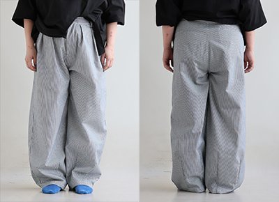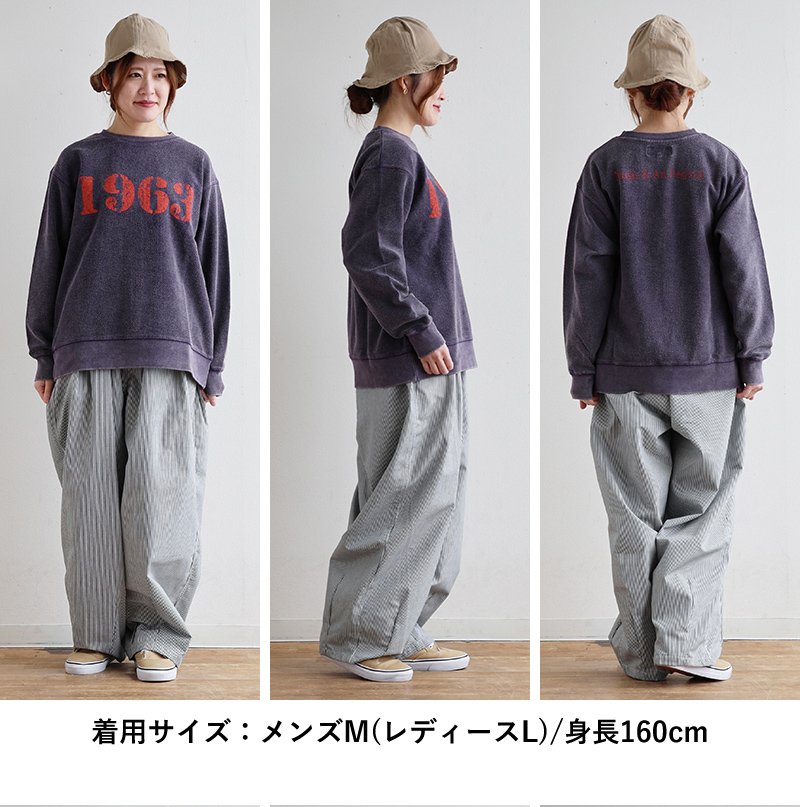 【モデルコメント】ウエストで穿きました。ゆったりとした穿き心地です。中は、何を合わせても問題はありません。 【客観的コメント】裾は地面に結構擦れる丈の長さです。大きめな感じで穿きたいならって感じのサイジングでしたね。