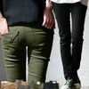 しっかりと目の詰まった肉厚なツイル地で、やや目の粗さやガシっとした硬さがあるのですが、ストレッチ入りで穿くとしなやかにフィットする独特の質感。ぐんっと伸縮性があり、キックバック性(戻る力)も強い生地です。透け感はありません。