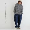 【モデルコメント】ウエストで穿きました。ウエストゴムは割と強めのフィット感です。中は、レギパンくらいまでが合わせやすそうですね。 【客観的コメント】くるぶしがほとんど隠れる丈の長さです。ゆとりはありながらも、良いシルエットで穿けていましたね。