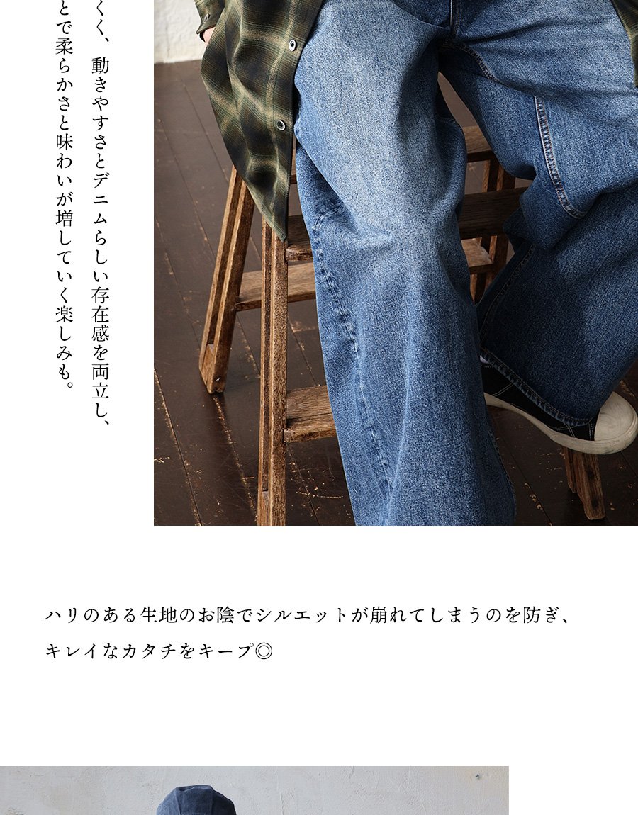 独特の曲線が描く、シルエットのキレイさ。 デニムパンツ テーパード バレルレッグ レディース 綿100 コットン 12オンス しっかり生地 ノンストレッチ 体型カバー 大きいサイズ ゆったり カジュアル パティ blue ビットブルー