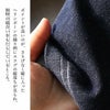 程よく厚みがあり、ふわっとした、とても柔らかく気持ち良い伸びを持つカットデニム地。軽やかな着心地で、ヘリンボーンの織り柄とスラブ感が表面に見られます。光にかざすと若干の透け感があります。
