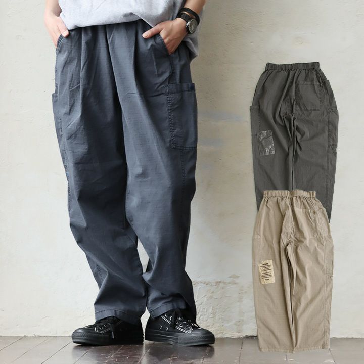 4. ワークパンツ ワイド 3マイル メンズ レディース コットン リップストップ ピグメント 褪せ色 ストレッチ 動きやすい 伸縮性 ウエストゴム 大きいサイズ 体型カバー カジュアル ヴィンテージ パティ Duckster