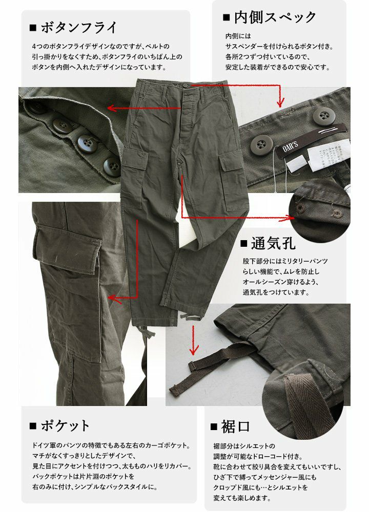 他の画像を見る 理解されにくいこの「不揃い感」こそ、魅力。 (オールズ) OAR'S クロップドパンツ カーゴパンツ 7分丈 ドイツ軍 後期型 モールスキン デットストック 販売価格 ¥ 7,370 税込 在庫切れ 詳細を見る お気に入りに登録する