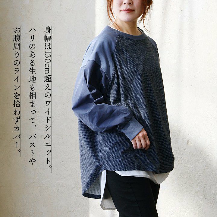 他の画像を見る だから、1枚でも安心。 スウェット プルオーバー 長袖 レディース インディゴ 異素材切り替え 無地 ストライプ ミニ裏毛 伸縮性 ゆったり 大きいサイズ 体型カバー カジュアル 秋 冬 パティ 2~3日でお届け 販売価格 ¥ 6,490 税込 カートに入れる お気に入りに登録する