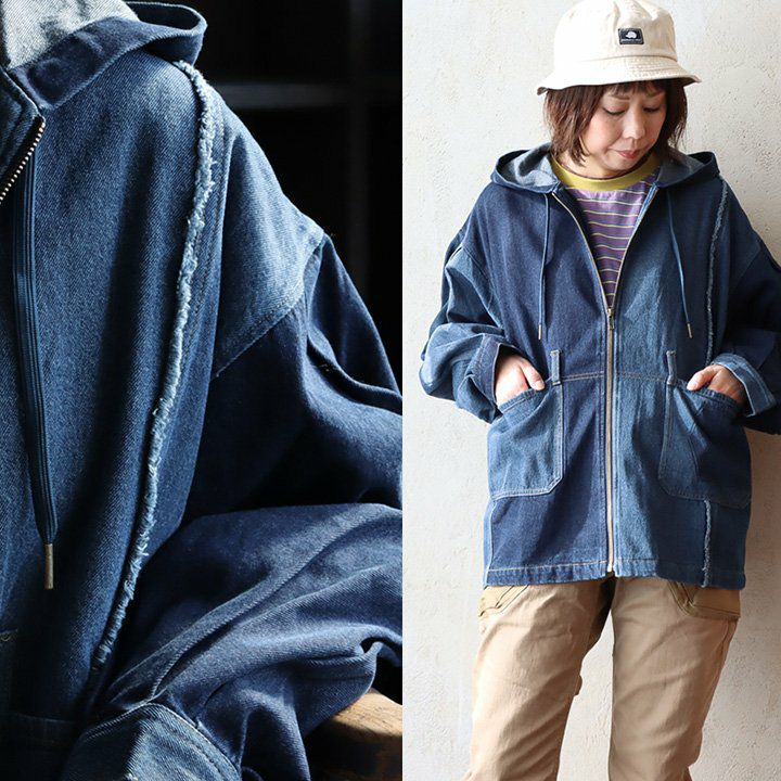 「ガチめ」なリメイクデニム好きへ。 パーカー 長袖 レディース デニム リメイク風 切り替え 綿100 コットン ノンストレッチ しっかり生地 ゆったり 大きいサイズ 体型カバー カジュアル 秋 冬 パティ