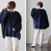 【モデルコメント】中は、トレーナーを合わせても問題はありません。ゆったりとした着心地でした。 【客観的コメント】太ももに少しかかるくらいの着丈の長さです。ユウコさんくらいの体型でも、ゆったりとしたシルエットになりますね。