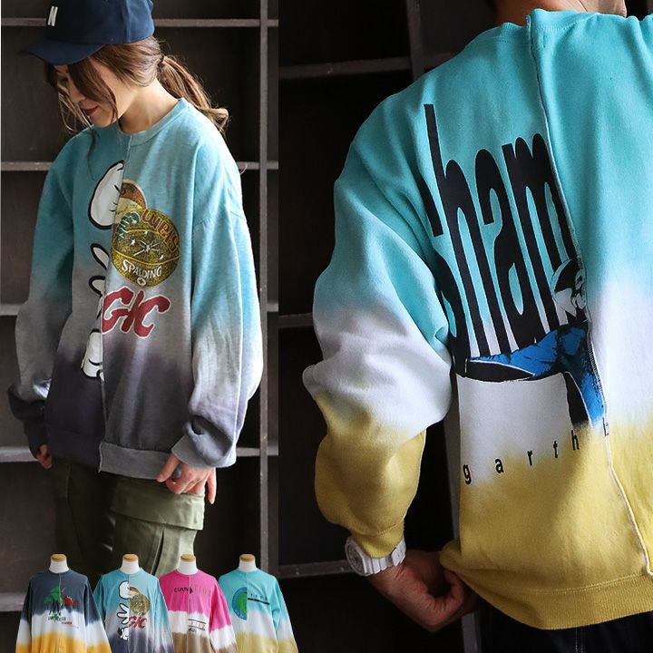 ありそうでなかった、独特のカジュアル感。 スウェット トレーナー 長袖 メンズ レディース グラデーション プリント リメイク ワイド すっきり 着痩せ 重ね着 大きいサイズ 落ち感 柔らかい カジュアル ヴィンテージ 古着 PATY