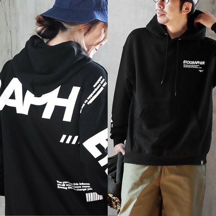 背中だけじゃなく、手も広げたくなる。 パーカー スウェット 長袖 メンズ レディース ロゴプリント ワンポイント ピスネーム ブラック コットン ポリエステル 裏地 カジュアル