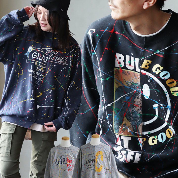 やんちゃな見た目で、これは絶対カブらない! スウェット トレーナー 長袖 メンズ レディース クルーネック リメイク 古着 ペイント ペンキ ロゴプリント 裏起毛 ゆったり 大きいサイズ 体型カバー カジュアル ヴィンテージ 秋 冬 パティ