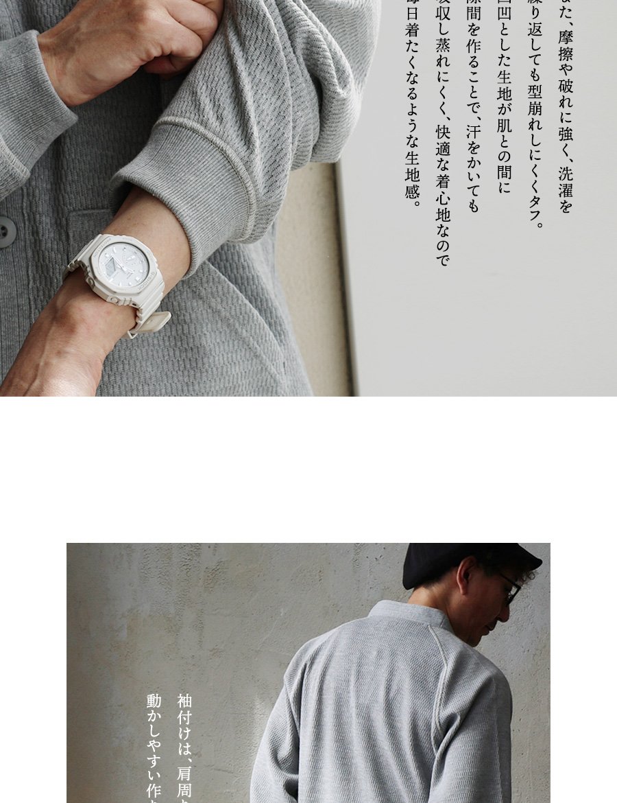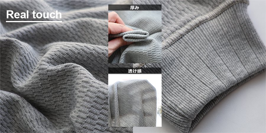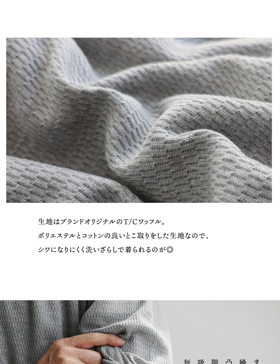 本体:凸凹とした見た目が特徴のT/Cワッフル生地。程よい厚みで伸縮性があり、光にかざすとほんのり透け感があります。