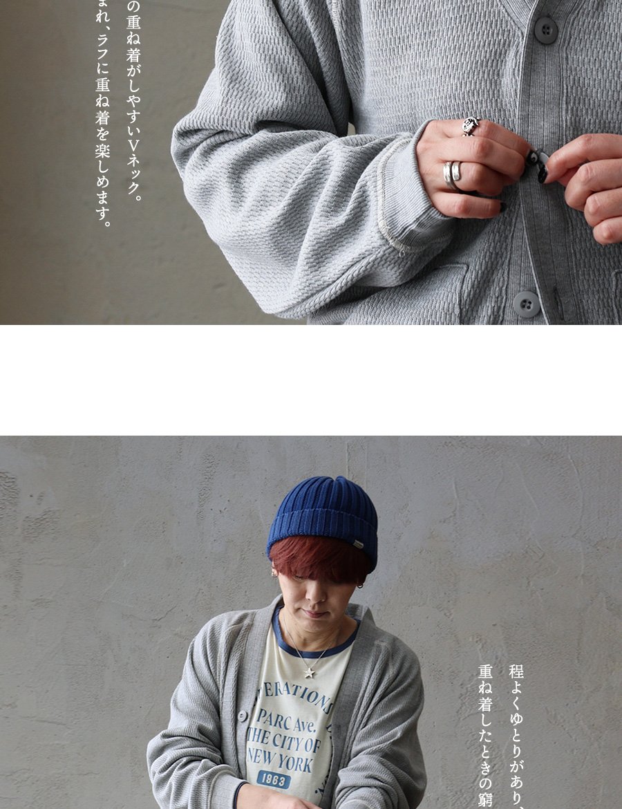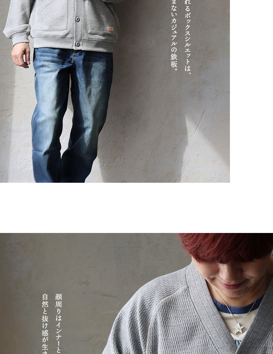 【モデルコメント】中は、厚手のTeeやカットソーは合わせやすそうです。程好くゆとりがあって、ボクは着るならこのサイズが良いですね。 【客観的コメント】まもるくらいの体型なら、Lサイズで丁度良い感じのサイジングだったね。