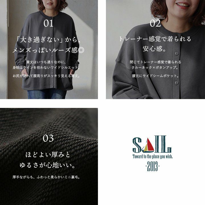 他の画像を見る 「フードなし、ヨレなし、寒さなし、色落ちなし」だから長く使える。 カーディガン スウェット ジップアップ 秋 冬 すっきり 着痩せ しっかり 丈夫 厚手 柔らかい 軽い 暖かい 裏起毛 綿100 USA コットン リブ ダブルジップ YKK メンズ レディース 長袖 クルーネック フードなし パティ SAIL セイル 2~3日でお届け 販売価格 ¥ 7,590 税込 在庫切れ カートに入れる お気に入りに登録する