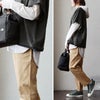【モデルコメント】中は、トレーナーを合わせても問題はありません。全体的にしっかりとゆとりがありましたね。 【客観的コメント】お尻は半分以上隠れる着丈の長さです。バランスの良いシルエットで着れていましたね。