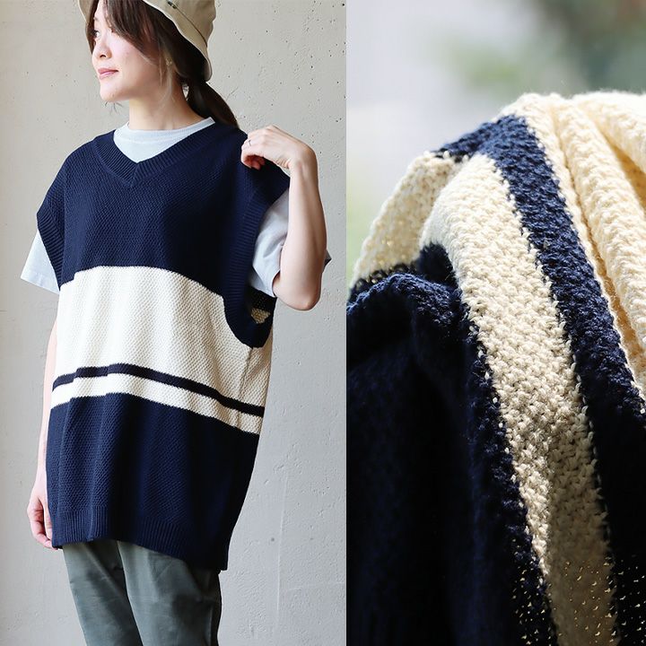 4. ベスト プルオーバー レディース メンズ サマーニット ニットベスト パネルボーダー Vネック ワイドシルエット 軽やか 着痩せ すっきり 重ね着 レイヤード カジュアル
