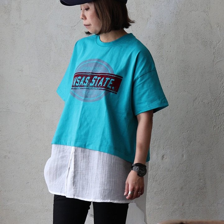 アメカジ好きの私が、自由に着られる「万能」コンビ。 Tシャツ メッシュTシャツ 5分袖 レディース クルーネック セット 綿100 コットン ポリエステル メッシュ ロゴ プリント 通気性 大きいサイズ 体型カバー カジュアル アメカジ 夏 パティ