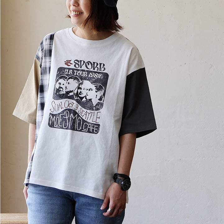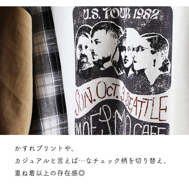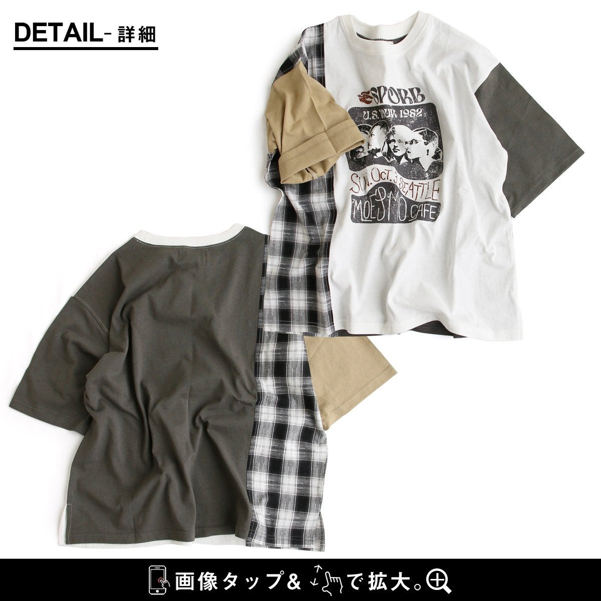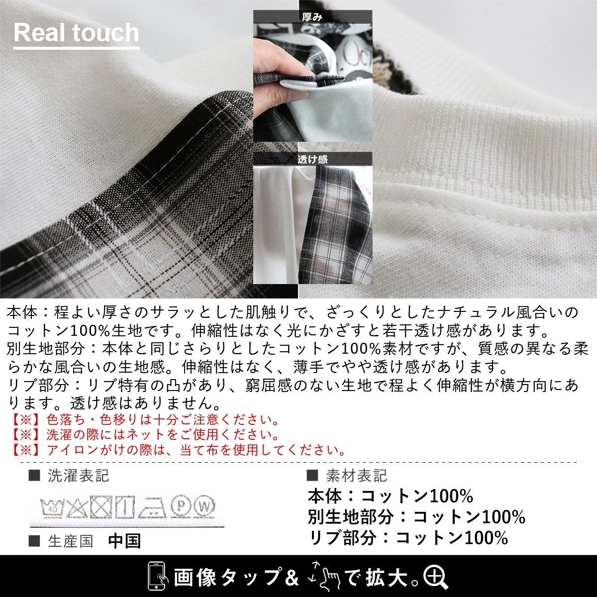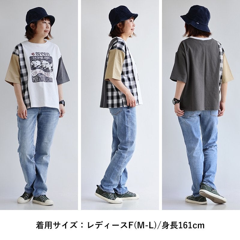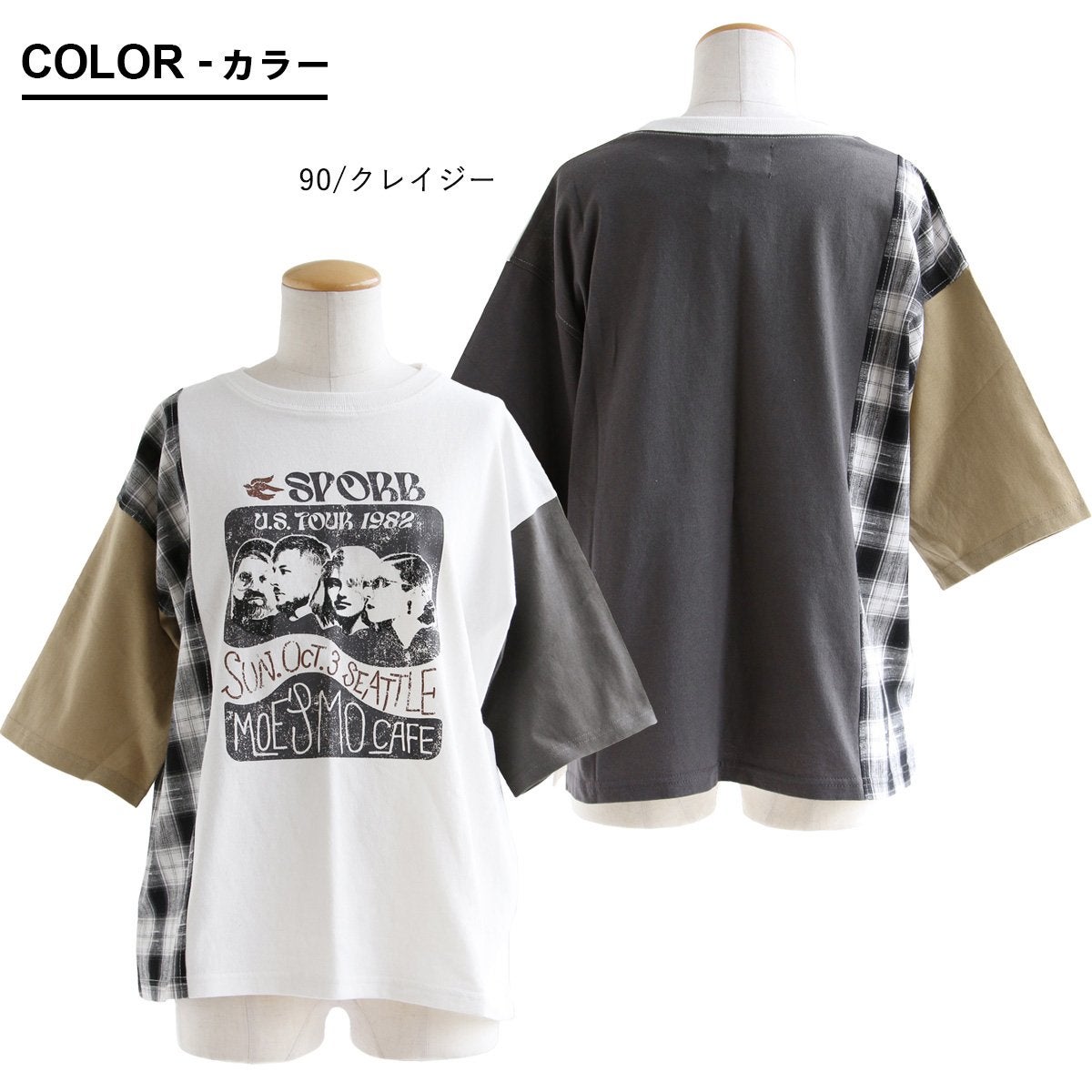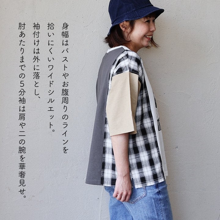 このくらいガッツリな「リメイクTシャツが欲しかった!」 【メール便50】 Tシャツ バンドT 5分袖 レディース クルーネック リメイク 配色 チェック柄 プリント 綿100% コットン 天竺 16番手 タフ 大きいサイズ ゆったり 体型カバー カジュアル 夏 夏服 パティ