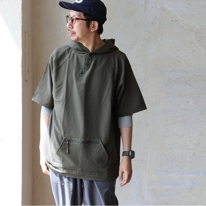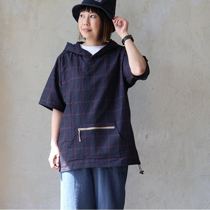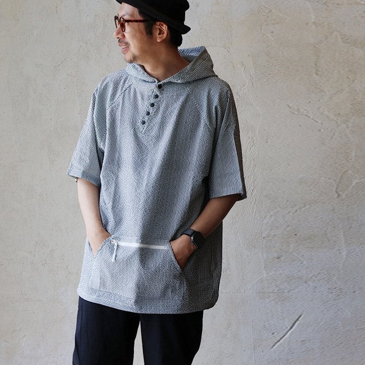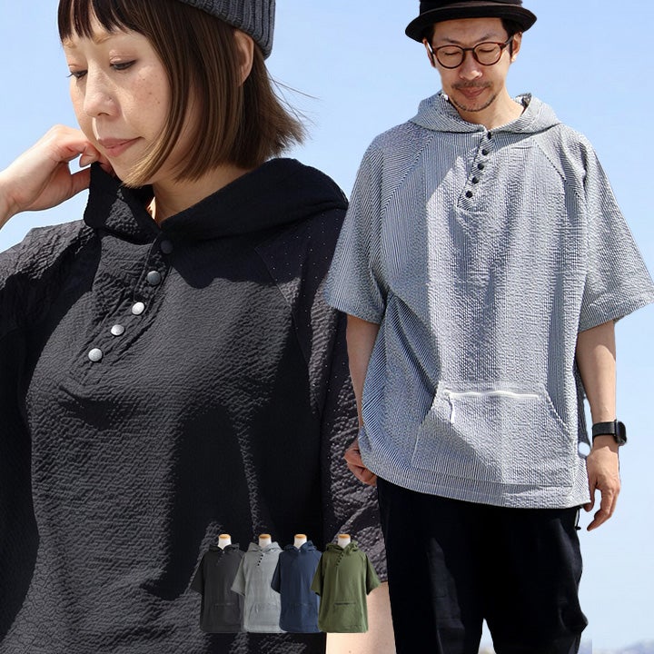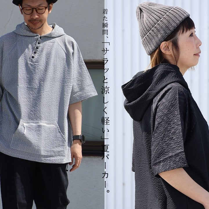 着た瞬間、「サラッと涼しく軽い」夏パーカー。 【メール便50】 涼しい シャツ パーカー メンズ レディース ロング ワイド すっきり 着痩せ ストレッチ シアサッカー 薄手 二の腕 お尻 体系 カバー ロゴ刺繍 UV 夏 ななめボタン ポケット カジュアル パティ Mr.Lumberjack ミスターランバージャック