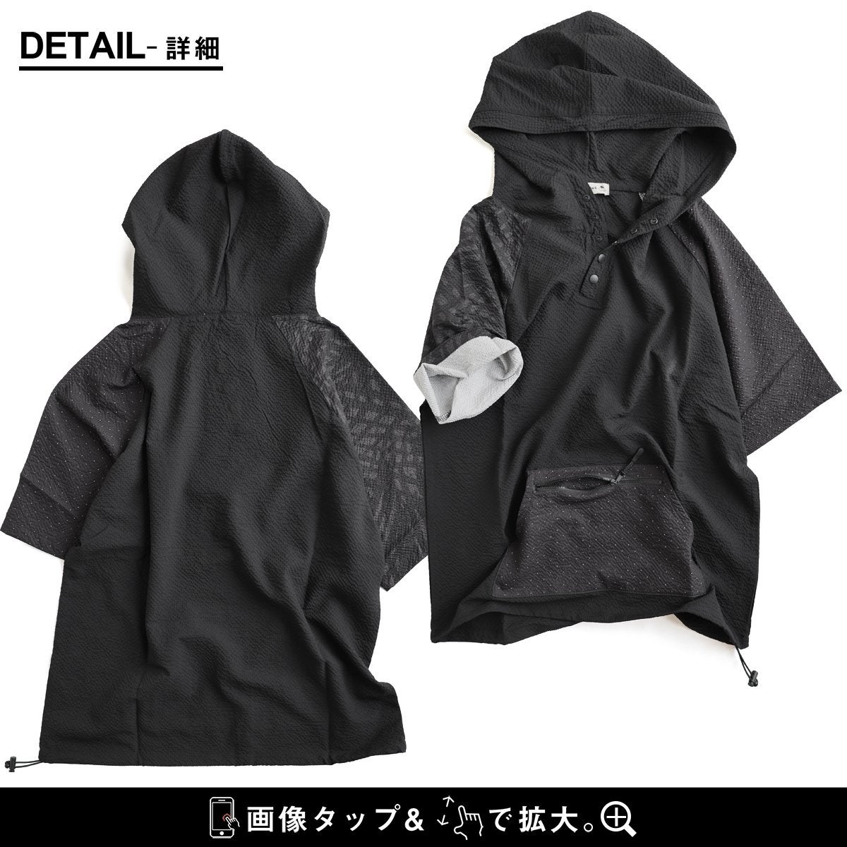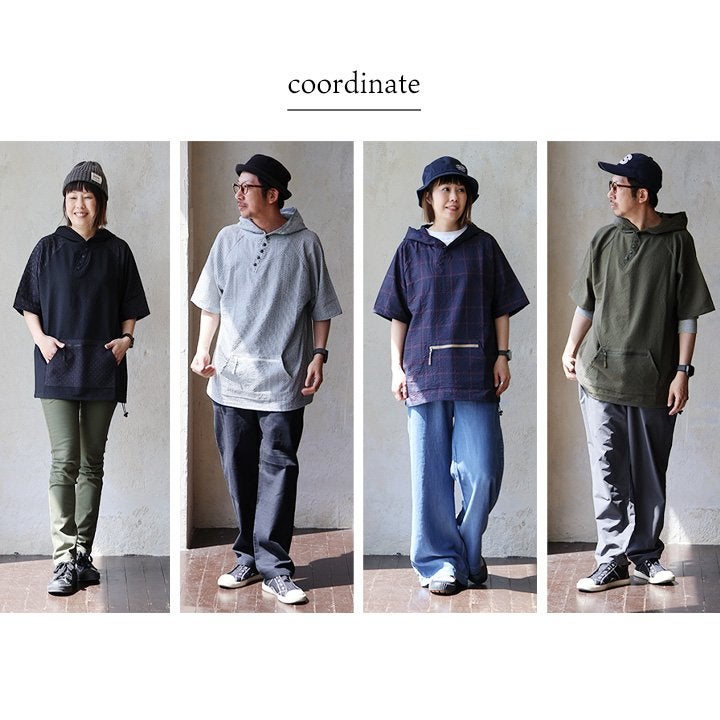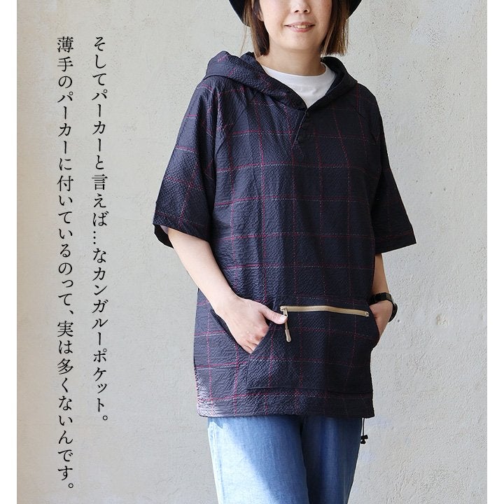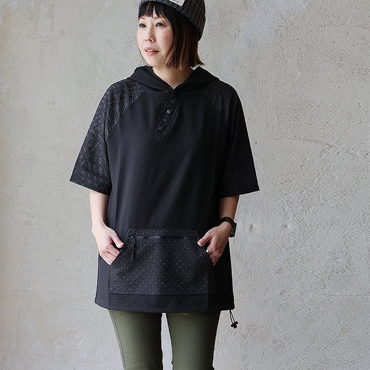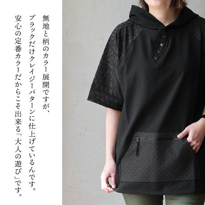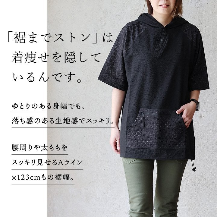 隠したいところ隠してくれて、『涼しくカッコよく』リラックス。 チュニック 6分袖 ロング ワイド レディース すっきり 着痩せ フーディー 切替 夏 初秋 パーカー tシャツ 重ね着 柔らか 綿100% USA コットン バック ボタン ポケット お尻 二の腕 隠れる カバー 5分袖 半袖 大人 カジュアル パティ Souple スプル